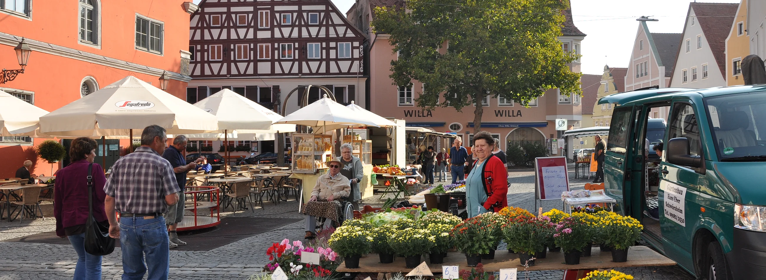 Besonders an Markttagen herrscht in der Nördlinger Innenstadt ein einzigartiges Flair. Viele Rieser, Ausflügler und Touristen genießen das geschäftige Treiben, das von der historischen Altstadt eingerahmt wird. Der Wochenmarkt ist aber nicht nur ein reines Open-Air-Kaufhaus, sondern auch Kommunikationsort. Die örtlichen Gastronomiebetriebe laden Passanten zum Verweilen inmitten des Wochenmarktes ein.