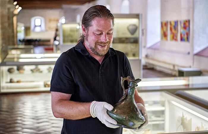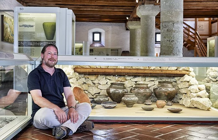 Museumsausstellung mit Vitrinen, archäologischen Funden und einer Person vor Säulen in historischem Gebäude