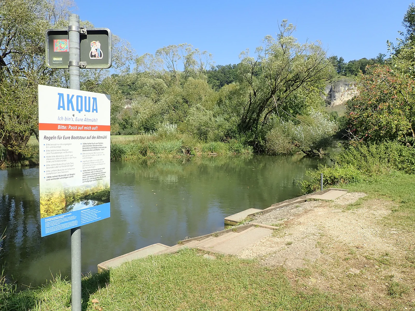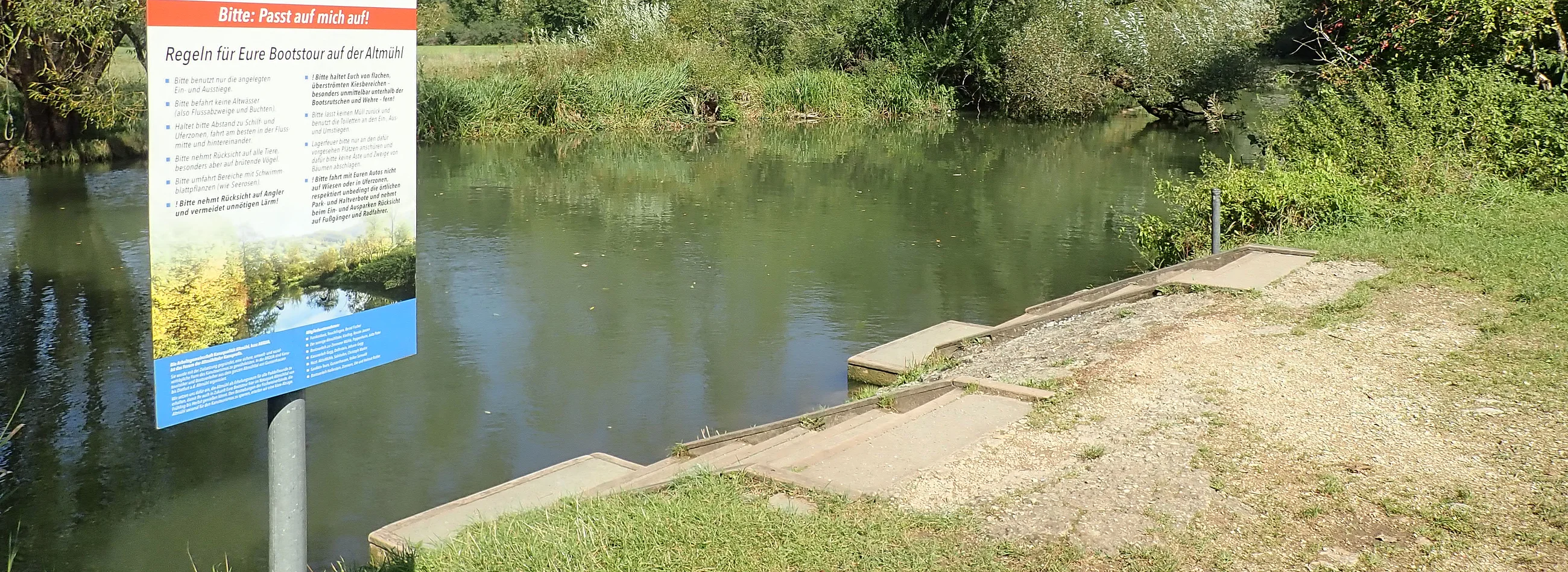Der Bootsausstieg befindet sich oberhalb des Wehres Hagenacker. Die Boote müssen ca. 50 m über Land umgetragen werden. Der Stieg ist mit Holz und einer Holzrutsche ausgebaut.
