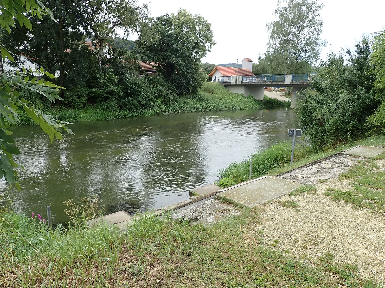 Der Bootsein- und -ausstieg bei Pfalzpaint ist mit Betonstufen und einer Holzrutsche für die Boote versehen.