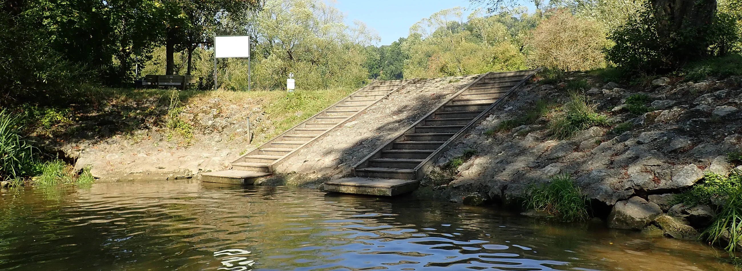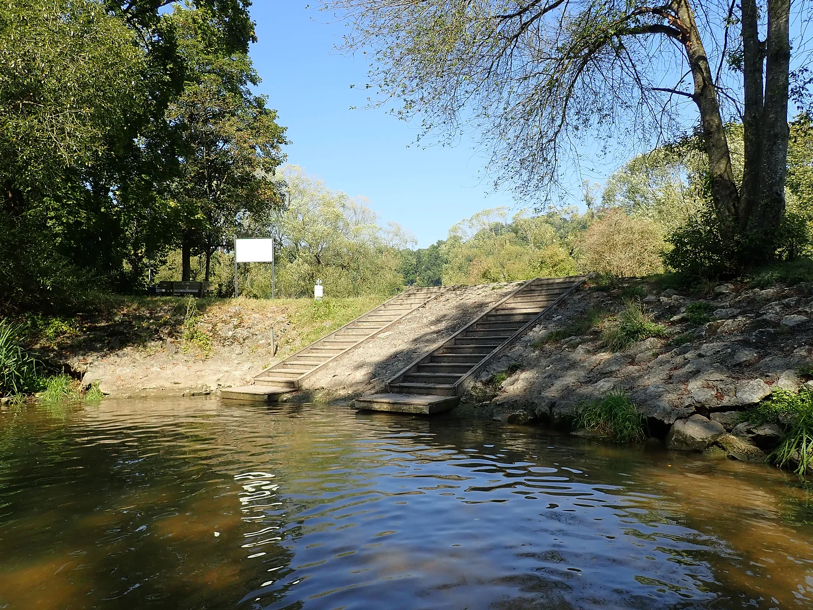 Der Bootseinstieg befindet sich unterhalb des Wehres Hagenacker. Die Boote müssen ca. 50 m über Land umgetragen werden. Der Stieg ist mit Holz und einer Holzrutsche ausgebaut.