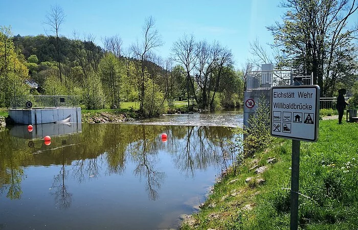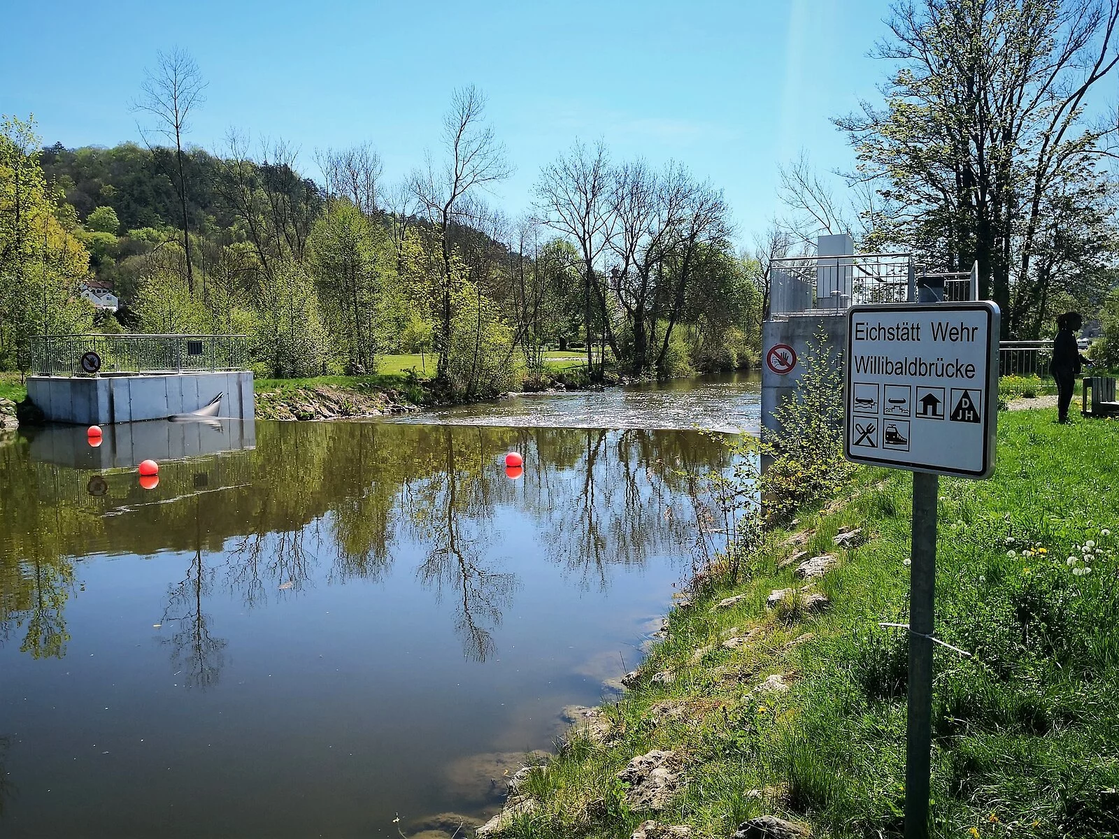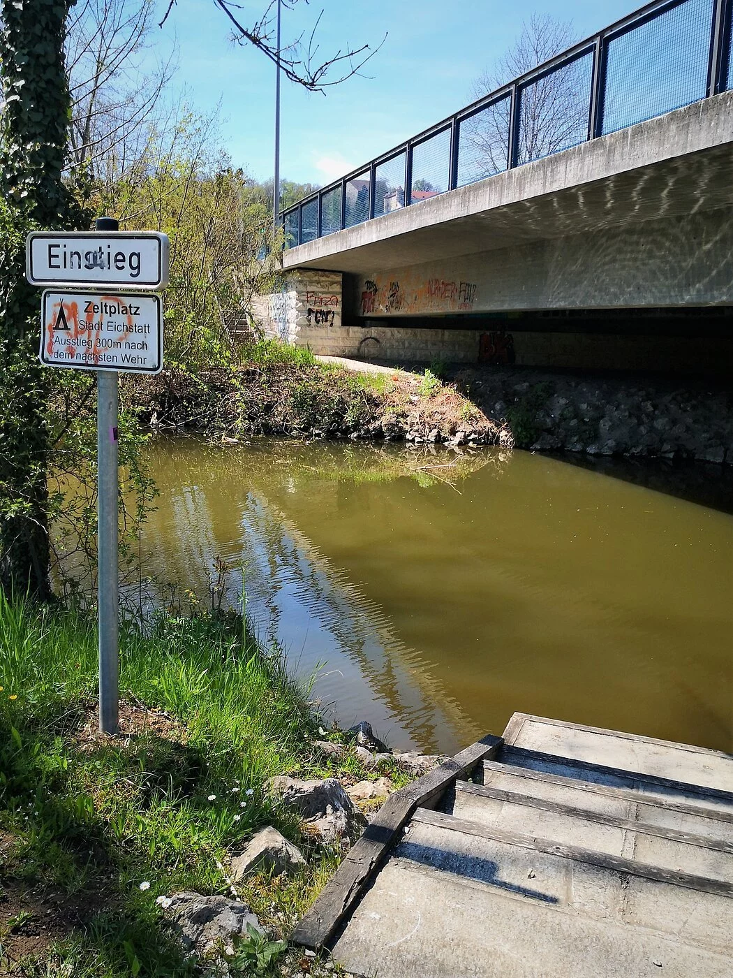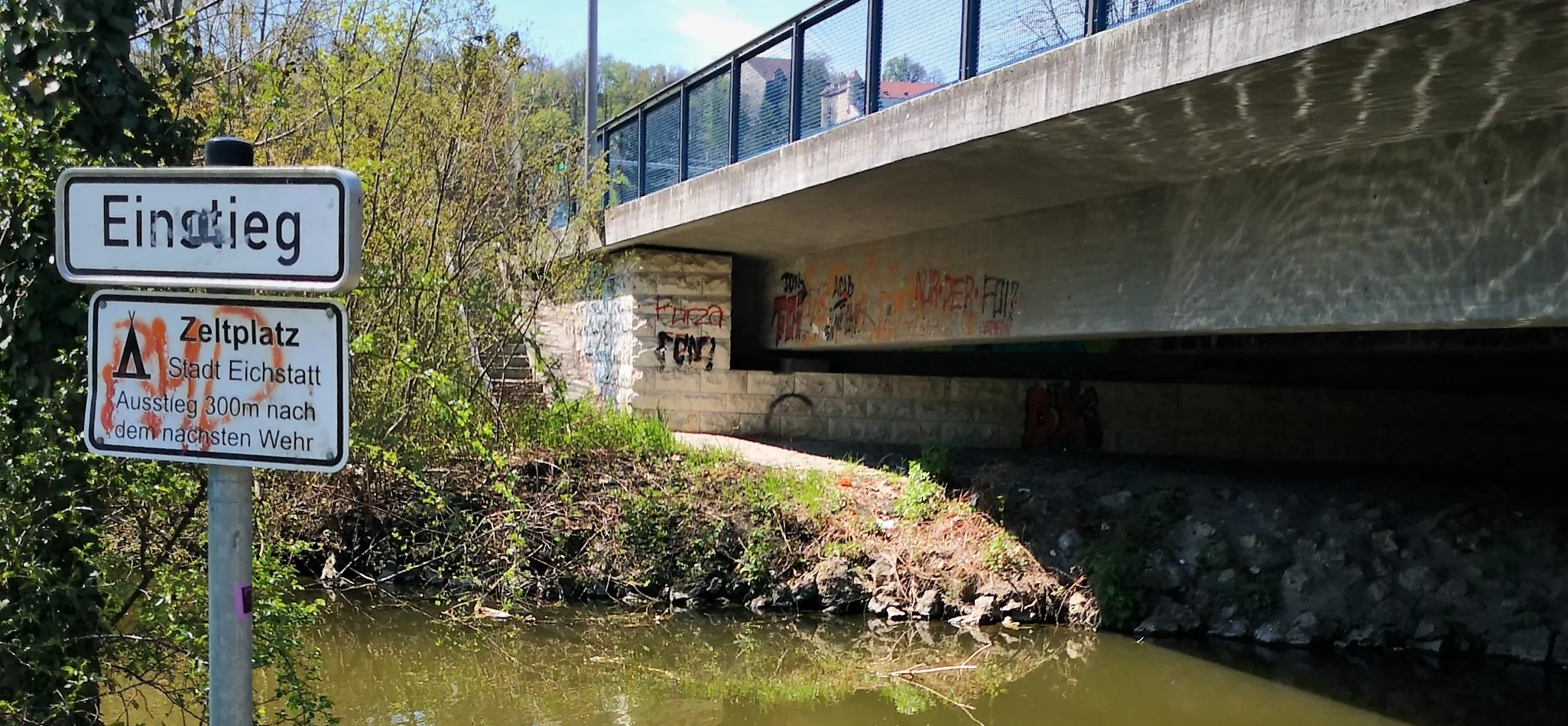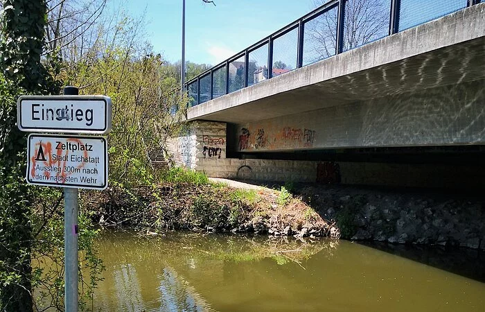 Der Bootseinstieg in Eichstätt befindet sich auf der Insel direkt nach der Willibaldbrücke. Boote müssen etwa 50 Meter über Land getragen werden, bevor die Fahrt auf der malerischen Altmühl weitergeht. Ein ausgewiesener Weg erleichtert den Transport etwas.