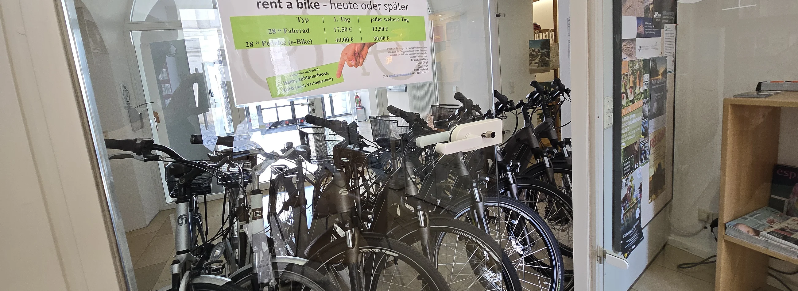 Für Einzelgäste und Kurzentschlossene bietet die Tourist-Info Eichstätt (Domplatz 8) aktuell vier normale Fahrräder und sechs Pedelecs von uns zum Verleih zu den Öffnungszeiten der Tourist-Information am Domplatz.