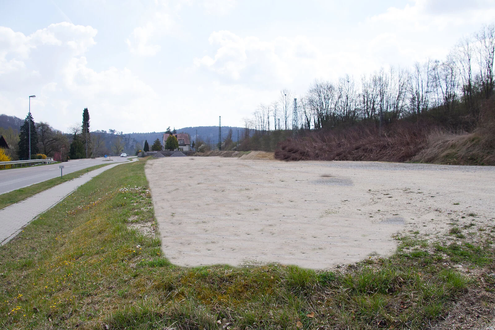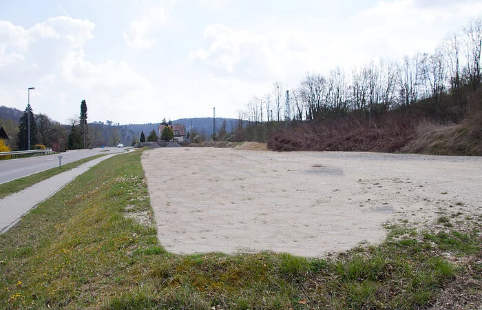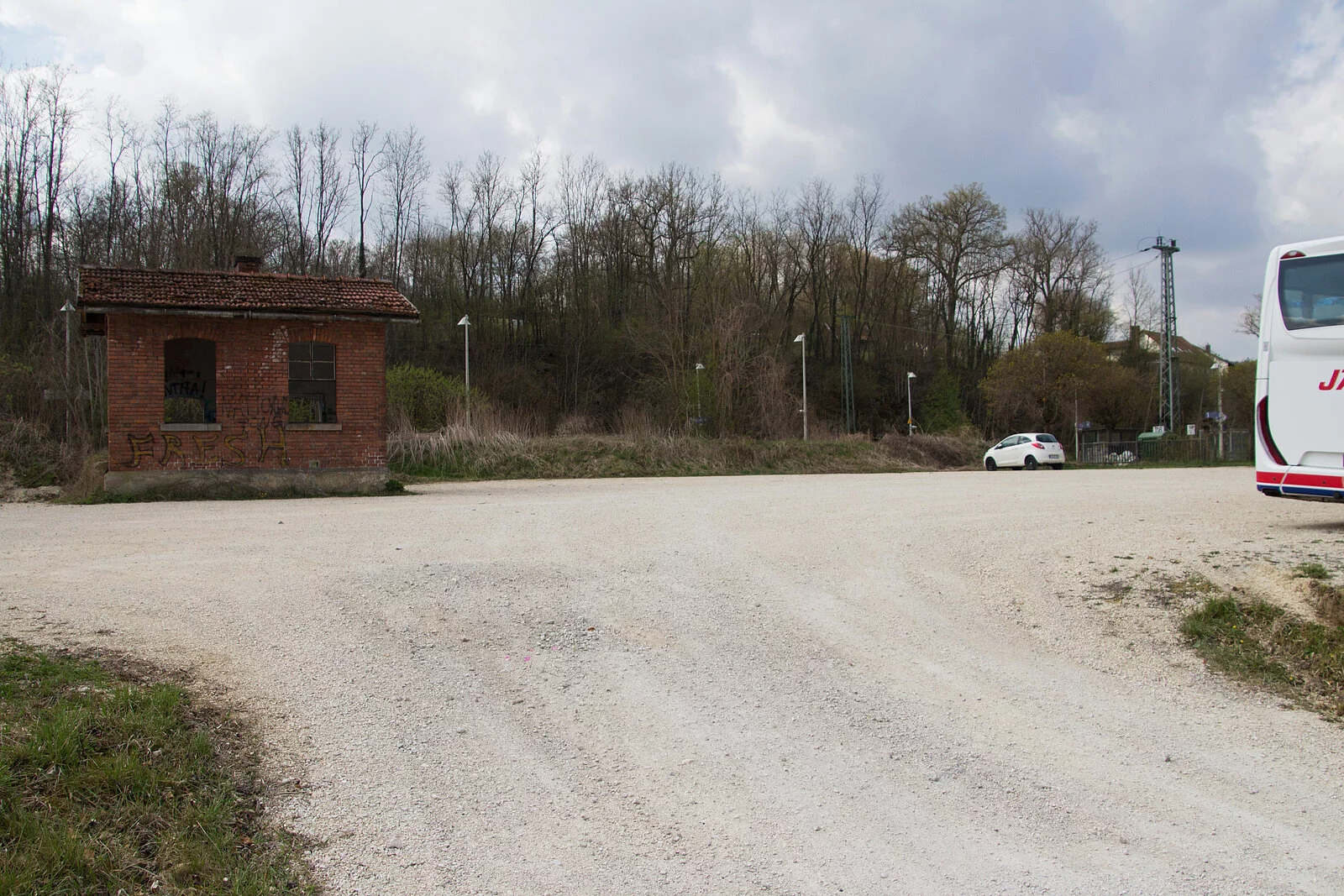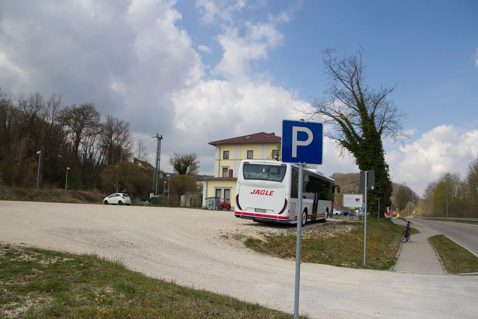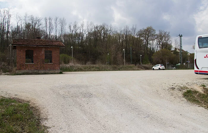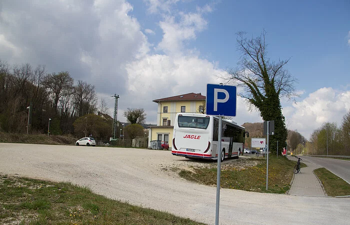 Der gut geschotterte Parkplatz direkt am Bahnhofsplatz hat genügend Stellflächen für Busse, Autos oder Campingfahrzeuge zur Verfügung. Der EDEKA-Supermarkt liegt gleich direkt daneben.