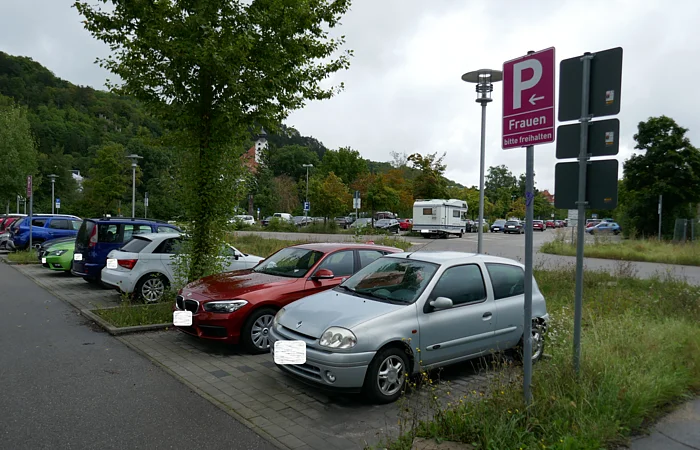 Vorne am Eingang zur Altmühlaue (parallel zum Radweg) und am Übergang vom Badsteg stehen 17 Frauenparkplätze zur Verfügung, ebenso 2 E-Ladesäulen und 7 Schwerbehindertenstellplätze.
