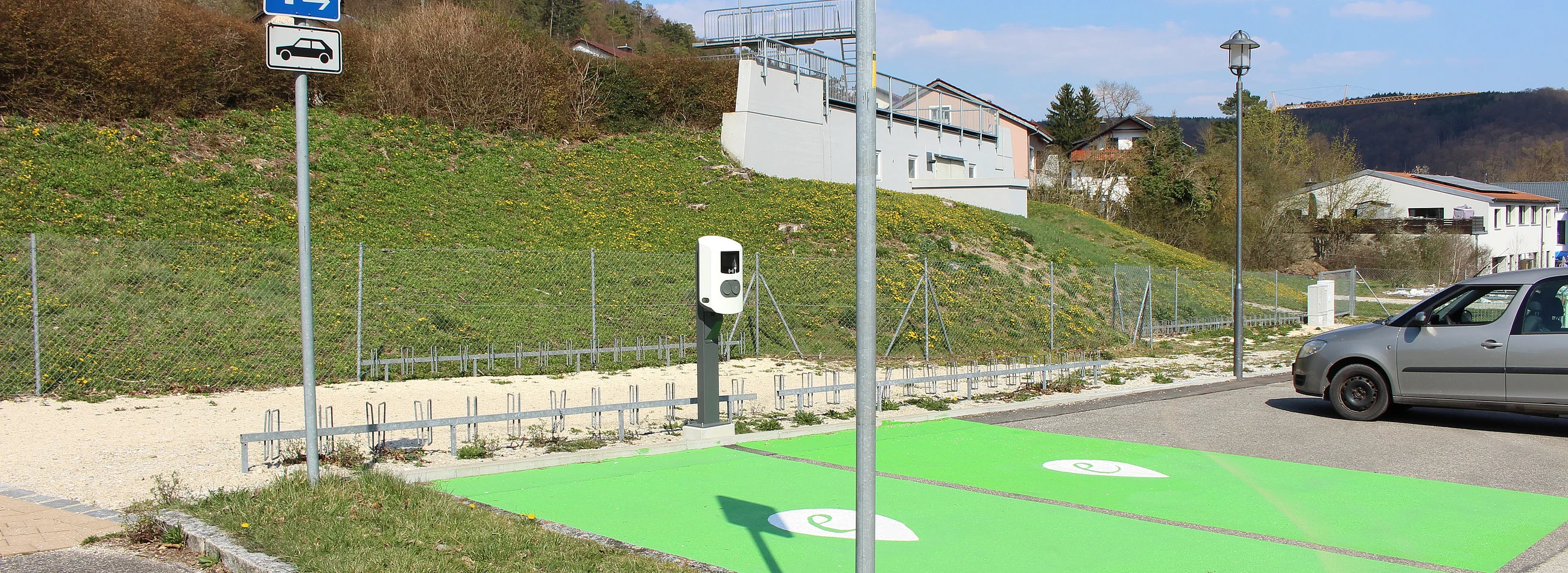Der Parkplatz bietet ca. 30 Parkplätze für Pkw und eine E-Ladesäule für Autos an.