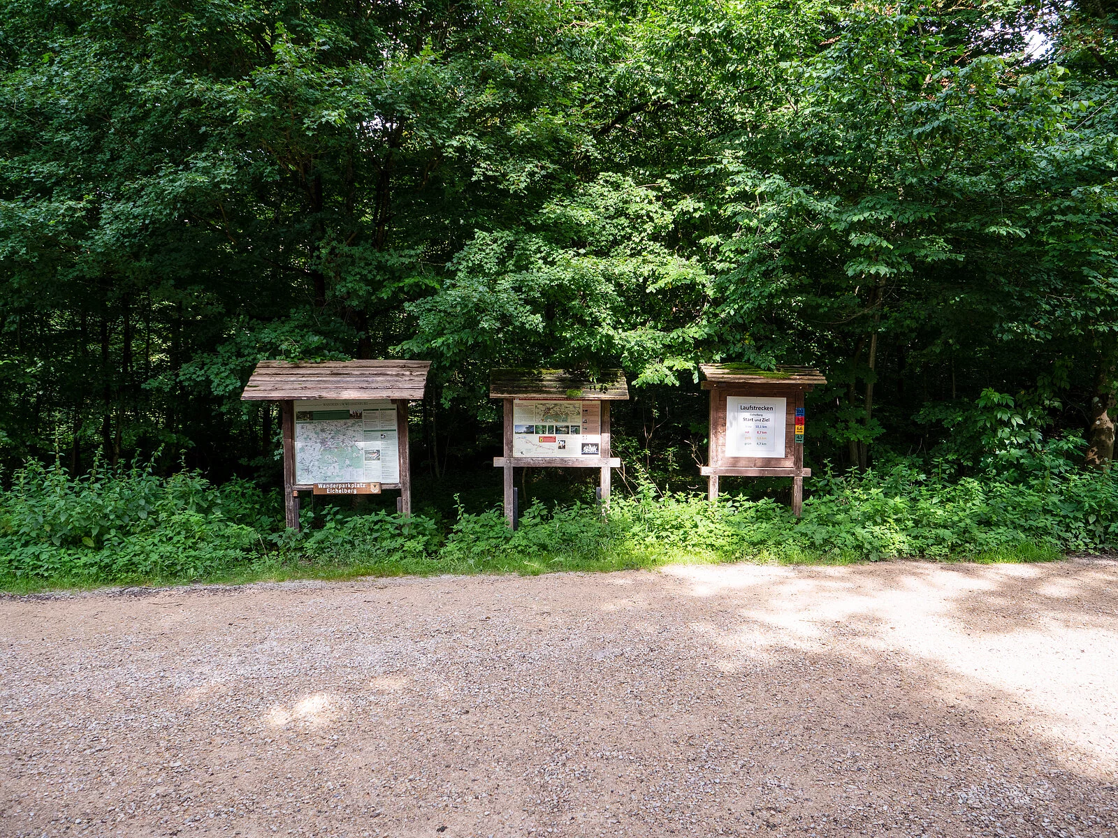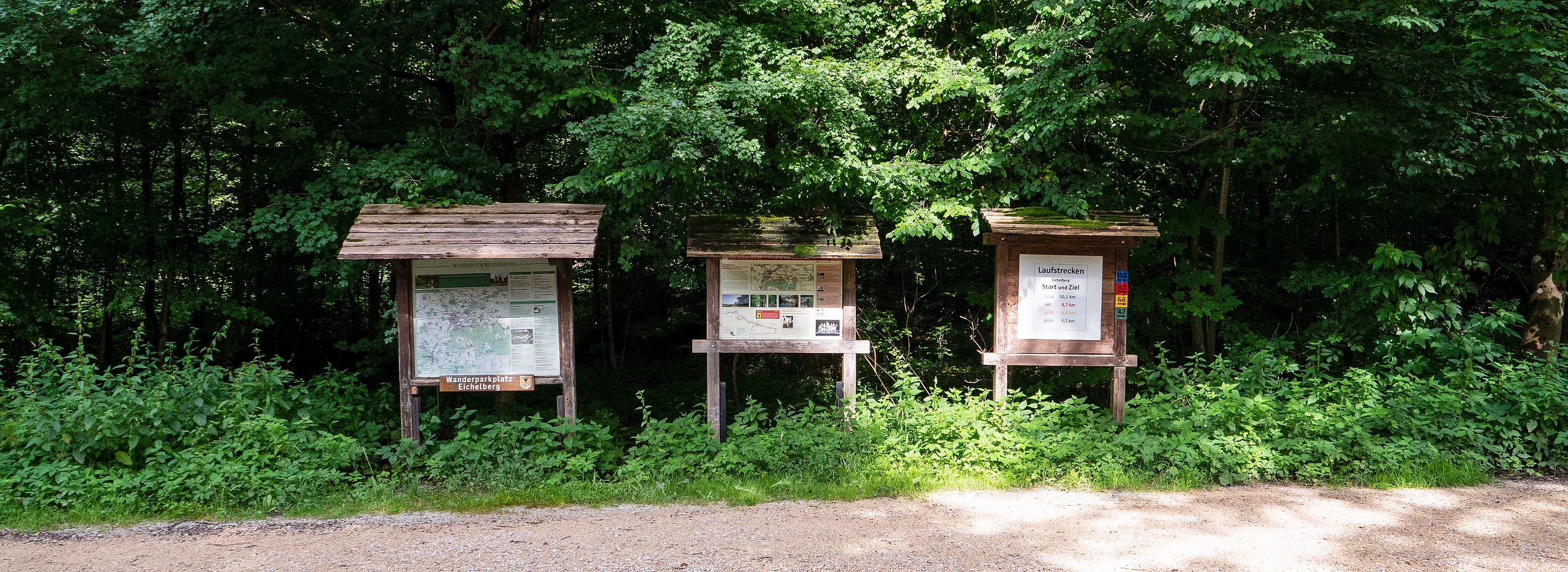 Vom Wanderparkplatz Eichelberg starten und enden vier verschiedene Laufstrecken mit unterschiedlicher Länge. Die kürzeste hat 4,7 Kilometer (grün), die längste 10,1 Kilometer (blau). Mit einer gelben Markierung ist die Strecke mit 6,6 km markiert und die rote Strecke ist 8,7 km lang.