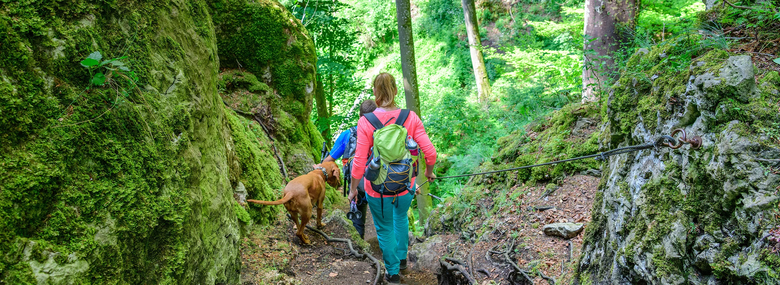 Angenehm kühl ist es an heißen Sommertagen unterm Blätterdach. Weiche Pfade führen zwischen den Stämmen alter Baumriesen hindurch. Unterwegs stoßen die Wanderer auf Felsen und Höhlen, sprudelnde Quellen oder auch mal auf eine Burgruine. Die Wälder im Naturpark Altmühltal stecken nämlich voller Entdeckungen. Erkunden lassen sie sich auf abwechslungsreichen Wegen, auf abenteuerlichen Routen wie dem Jägersteig bei Dollnstein oder auf familienfreundlichen Lehrpfaden wie dem KultURwald in Eichstätt.