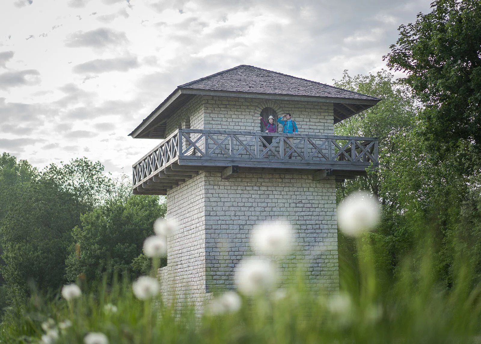 Kurz nach Erkertshofen wird die einzige Rekonstruktion eines steinernen Limeswachtturms in Bayern erreicht. Es lohnt sich, die schmale Stiege im Inneren emporzusteigen: Wie schon die römischen Grenzsoldaten genießt man den Blick übers Land. Weiter geht es durch ein stilles Waldgebiet und über die sonnige Jurahochebene. Nach Pfahldorf begegnet man einem besonders gut nachvollziehbaren Teilstück des Limes. Noch bevor der Limeswanderweg die Altmühl erreicht, trifft der Wanderer auf einen hölzernen Wachtturm und auf die gesicherten Mauerreste eines ehemaligen Wachtturmes aus Stein. In Kipfenberg geht es anschließend hinauf zum Römer und Bajuwaren Museum auf der Burg Kipfenberg, wo auch der neue Infopoint Limes auf wissensdurstige Besucher wartet: mit der Inszenierung einer römischen Wachtstube und vielen Tipps ein anschaulicher Wegweiser zum Limes und der römischen Geschichte im Naturpark Altmühltal. In schattigen Wäldern die Ruhe genießend, folgen Wanderer weiter der im Volksmund ehemals Teufelsmauer genannten römischen Grenze bis Denkendorf.