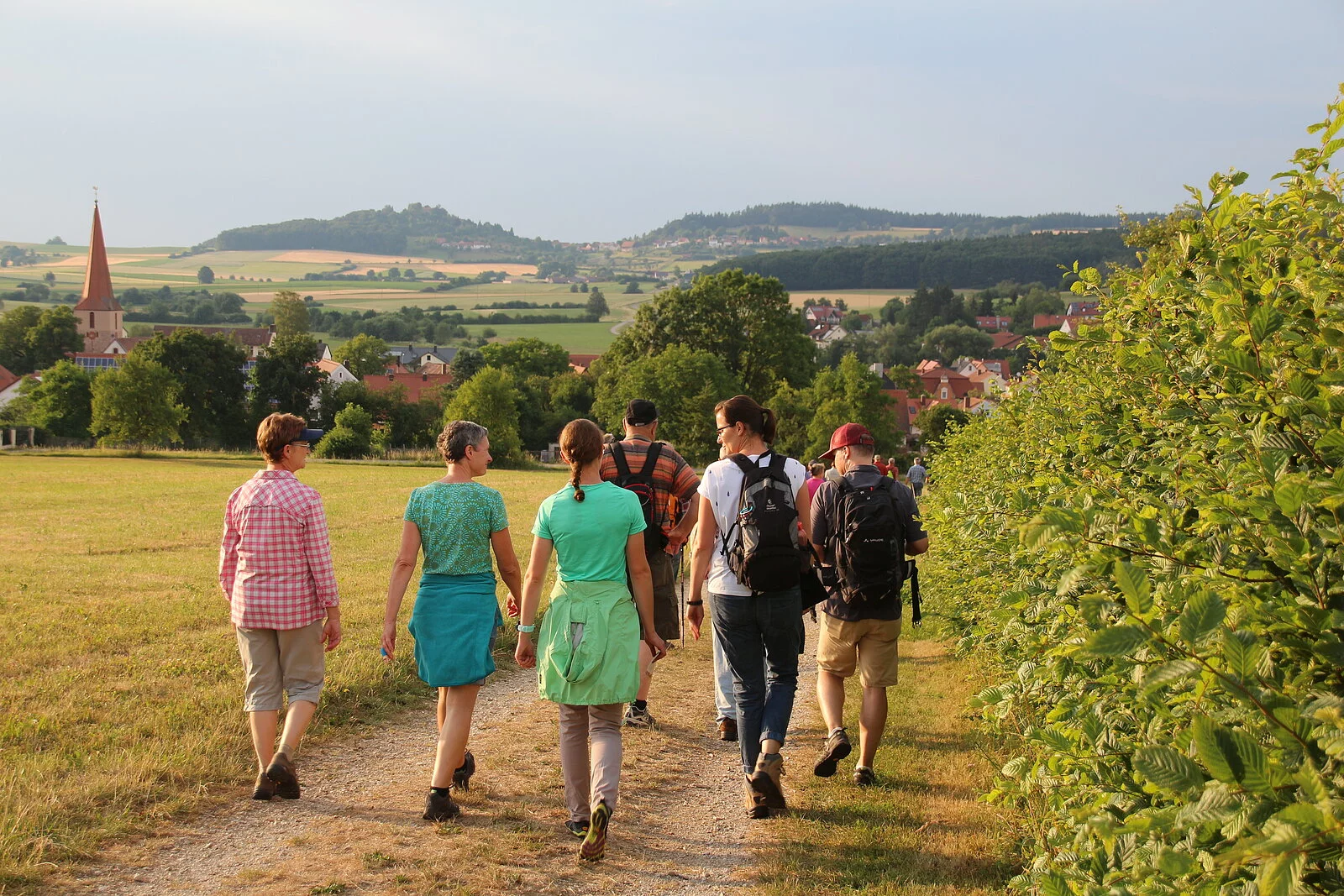 Der Startpunkt der gut sieben Kilometer langen Wanderung ist am Marktplatz vor dem Museum Fundreich in Thalmässing. Der abwechslungsreiche Weg führt auf dem früheren Kirchenweg von Waizenhofen entlang lichter Waldwege am Übergang vom schwarzen zum weißen Jura über eine Anhöhe steil bergab nach Gebersdorf. Dort ging früher eine alte Handelsstraße hindurch. Turmhügel in Hagenich und Gebersdorf zeugen heute noch davon. Ein Waldweg leitet bergauf nach Waizenhofen und über den Waizenhofeer Espan an Resten von Grabhügeln vorbei. Entlang einer schönen Lindenallee und wieder steil bergab über die Schlittenwiese „auf der Leiten“ mit einer grandiosen Panoramasicht geht zurück nach Thalmässing. Nach getaner Arbeit kann man sich dann in einer der zahlreichen Gaststätten mit herrlichen Biergärten stärken oder ein Eis im Eiscafé genießen.