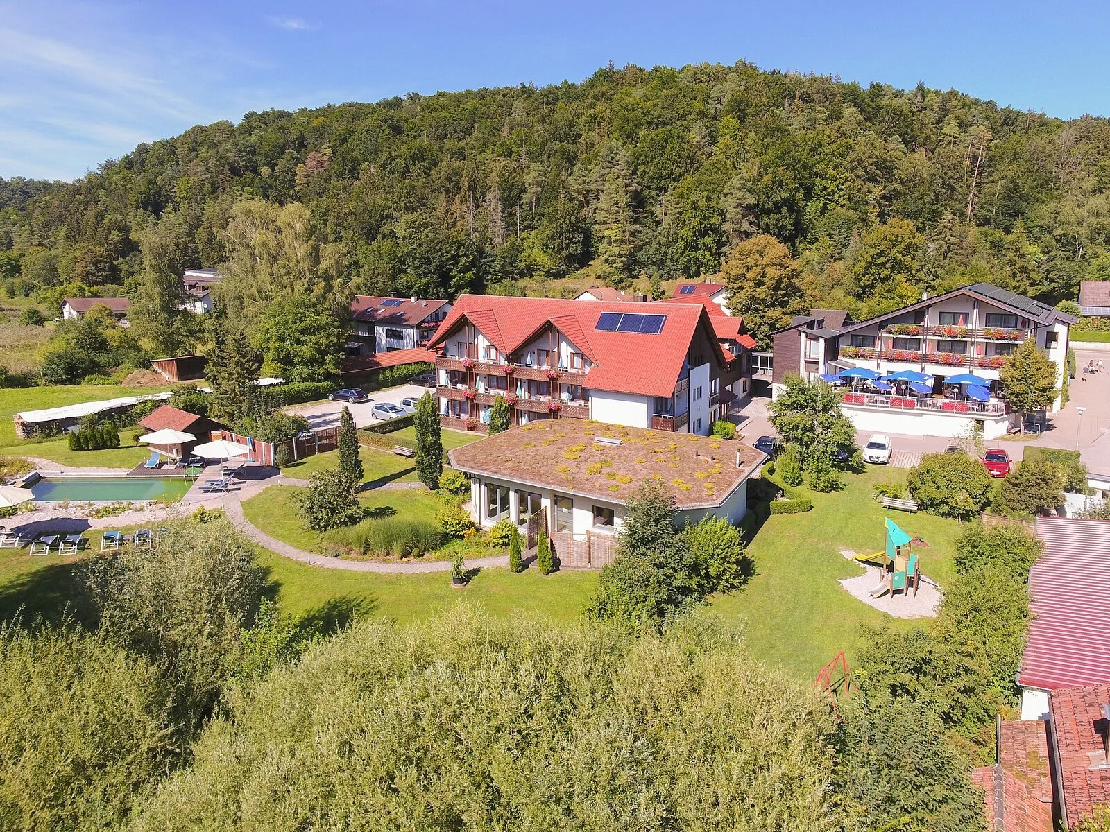 Nach Überqueren der Schambach passieren wir den Gasthof „Zur Linde“, wo die Gelegenheit besteht, sich für den Weiterweg zu stärken – mit saisonalen, bayerischen Gerichten oder frisch zubereiteten Forellen, einer Spezialität des Hause. An der Straßenkreuzung Straßenkreuzung besteht die Möglichkeit, noch zwei kurze Abstecher zu machen: Linkerhand geht es zum Wassertretbecken (200 m) mit kleinem Spielplatz, rechterhand kommen wir zur Katholischen Wallfahrtskirche „Heilig Kreuz“ (200 m) sowie zur Biberplattform (1 km) etwas außerhalb des Ortes.