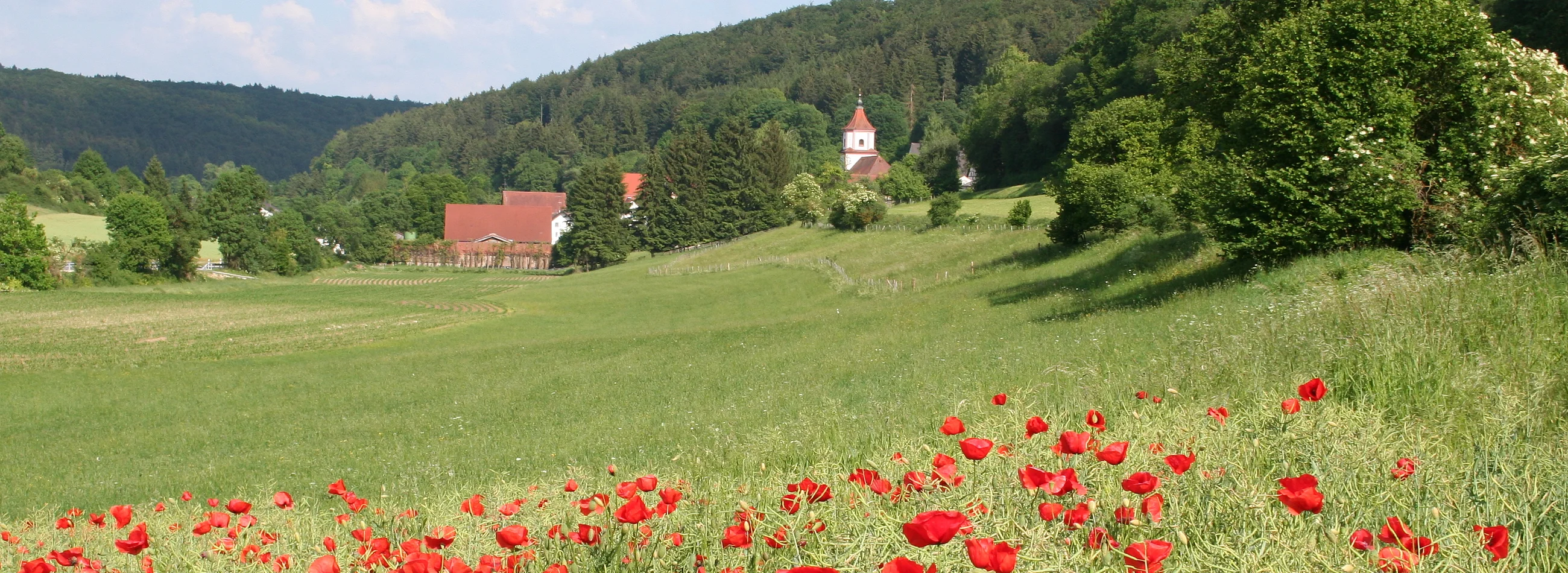 Links vorbei am Gasthof Bauer-Keller führt zunächst ein schmaler Weg über eine Wiese. Am Waldrand gehen wir halbrechts einen schattigen steilen Fußweg etwa 100 Höhenmeter bergauf. Auf der Anhöhe angekommen folgen wir der Beschilderung über Waldwege geradeaus über den Bergrücken. Am zweiten Querweg befindet sich bei einem Bildstock eine Sitzgruppe, die zur Rast einlädt. Nach ca. 150 m hangabwärts kommen wir zu einer Wegkreuzung. Hier bietet es sich an einen Abstecher von ca. 100 m nach links bis zur Antonius-Kapelle zu machen und diese zu besichtigen.