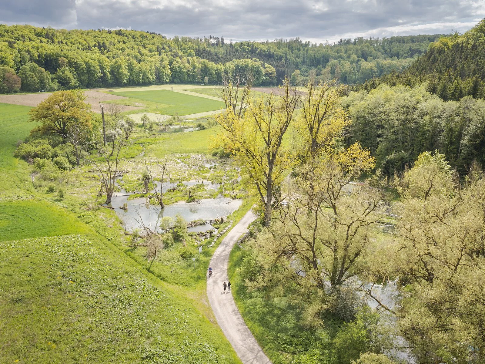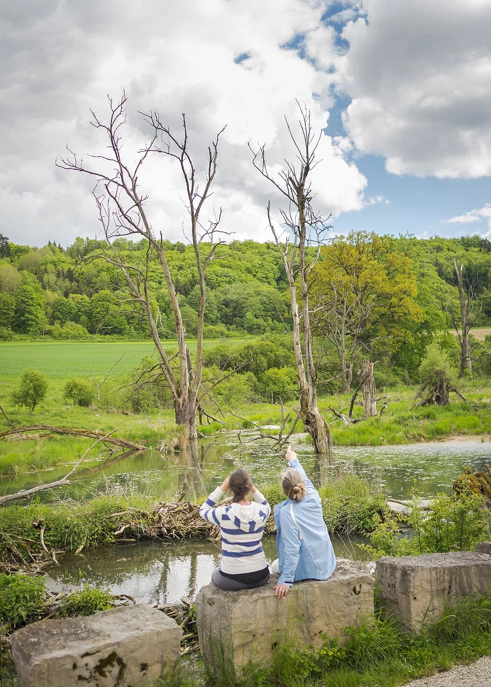 Die Straße hier vorsichtig überqueren und ohne Ausschilderung (nicht dem Frankenweg oberhalb folgen) weiter kurz nach unten. Nun rechts ab bis hin zum Anwesen der Untermühle, das wir durchqueren, und die Rohrach überschreiten. Der breite Schotterweg verläuft mal näher, mal weiter entfernt, an einem naturnahen Bachlauf vorbei durch diesen geschützten Landschaftsteil. „Ein von Bibern geschaffenes Paradies“ – so titelt eine der Infotafeln gegen Ende dieser herrlichen, beeindruckenden von Bibern, dem größten europäischen Nagetier, gestalteten Bachlandschaft.