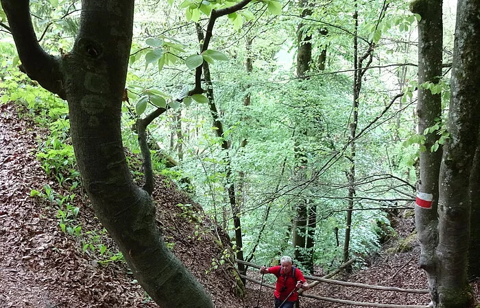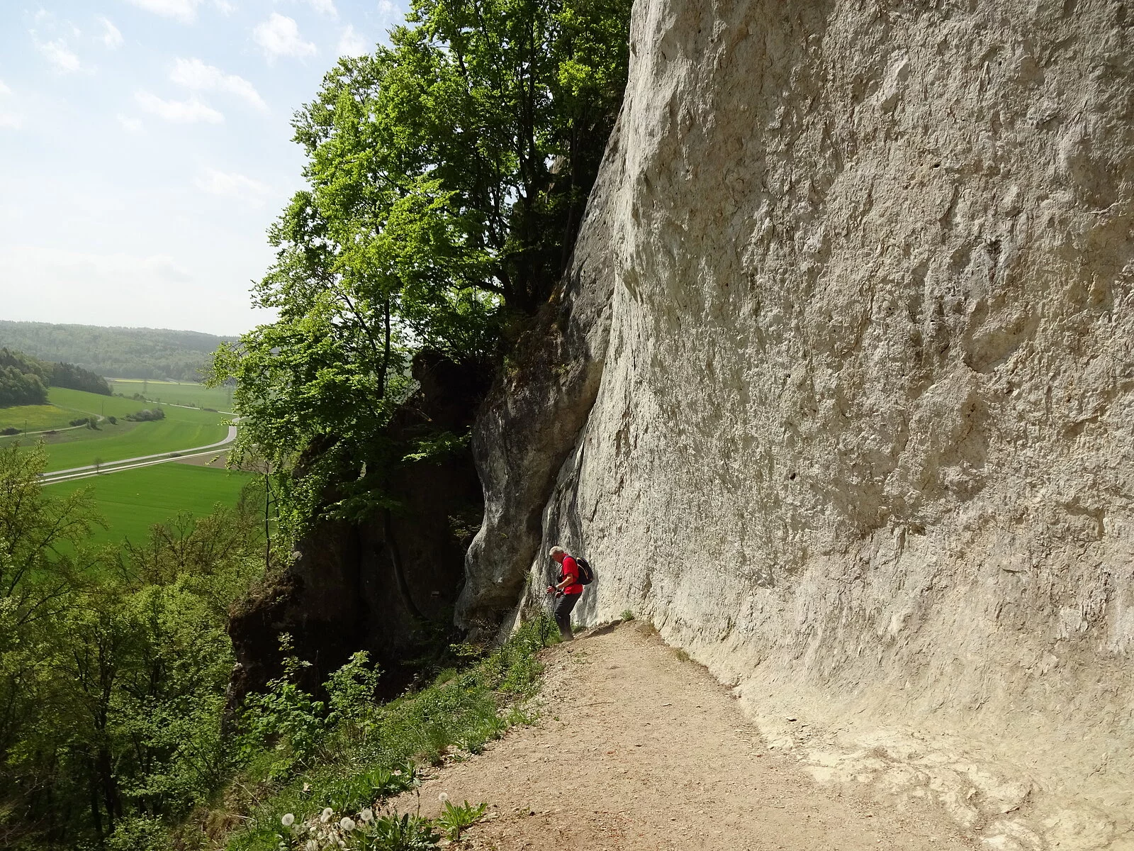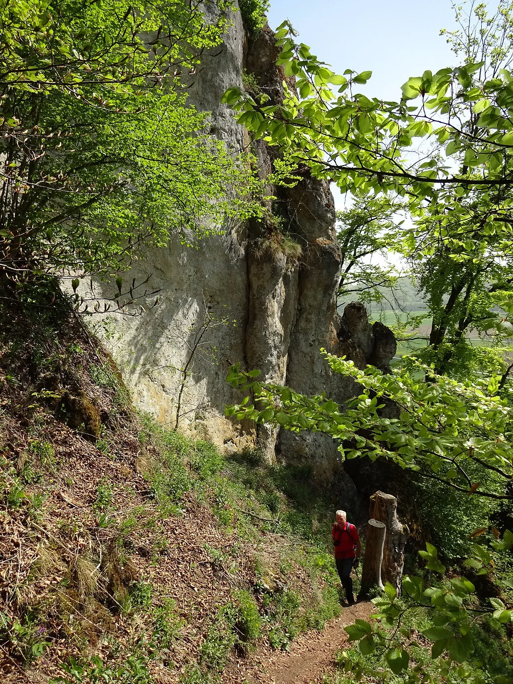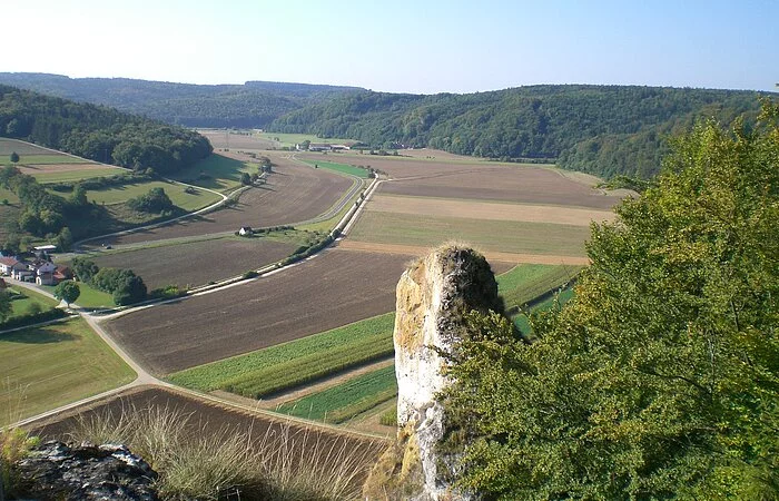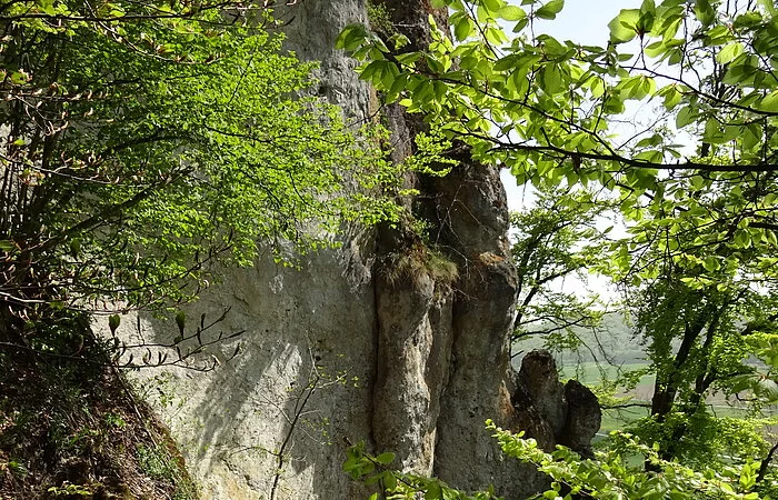 Von dort die Straße und den Radweg überqueren und dem Wegweiser Richtung „Jägersteig“ folgen. Auf einem breiten Forstweg geht es etwa 400 m Richtung Ried, dann zweigt der Jägersteig aufsteigend nach rechts ab (Hinweisschild und Markierung an einer großen Informationstafel beachten). Der fast alpine Steig führt mit geringen Höhenunterschieden am Hang entlang, mit schönen moosbewachsenen Bäumen und beeindruckenden Felsformationen, wobei auch einige schwierigere Passagen zu bewältigen sind, welche mit Stahlseilen oder Holzgeländer gesichert sind. Zwischendurch gibt es immer wieder einmal einen Ausblick nach Ried und über das Wellheimer Trockental. An zwei Stellen ist der Jägersteig für eine kurze Strecke schmal und etwas ausgesetzt, aber völlig unkritisch für den geübten Wanderer. Der Jägersteig endet nach ca. 3,5 Km am Felsentor Beixenstein bzw. etwas unterhalb davon. Der Rückweg zum Parkplatz verläuft am Waldrand unterhalb des Naturwaldreservates Beixenhart. Wem die Wanderung zu kurz ist, der kann schon von Dollnstein aus gehen. Bereits hier findet man Hinweisschilder auf den Jägersteig.