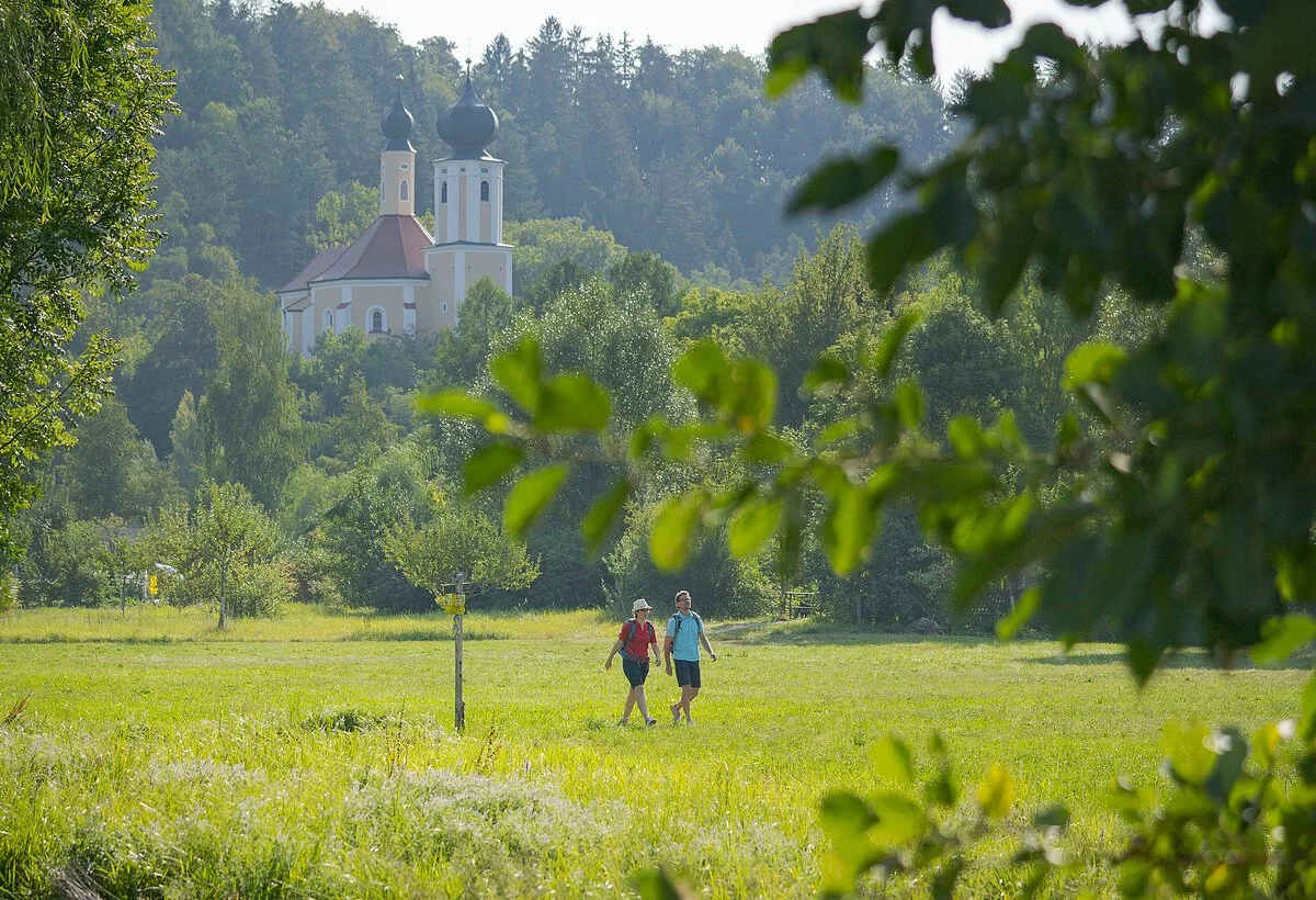 Ein Pärchen wandert unterhalb der Wallfahrtskirche Breitenbrunn entlang satter grüner Wiesen. Die Wallfahrtskirche ist von grünen Wäldern umgeben.