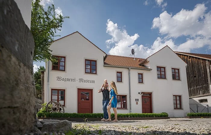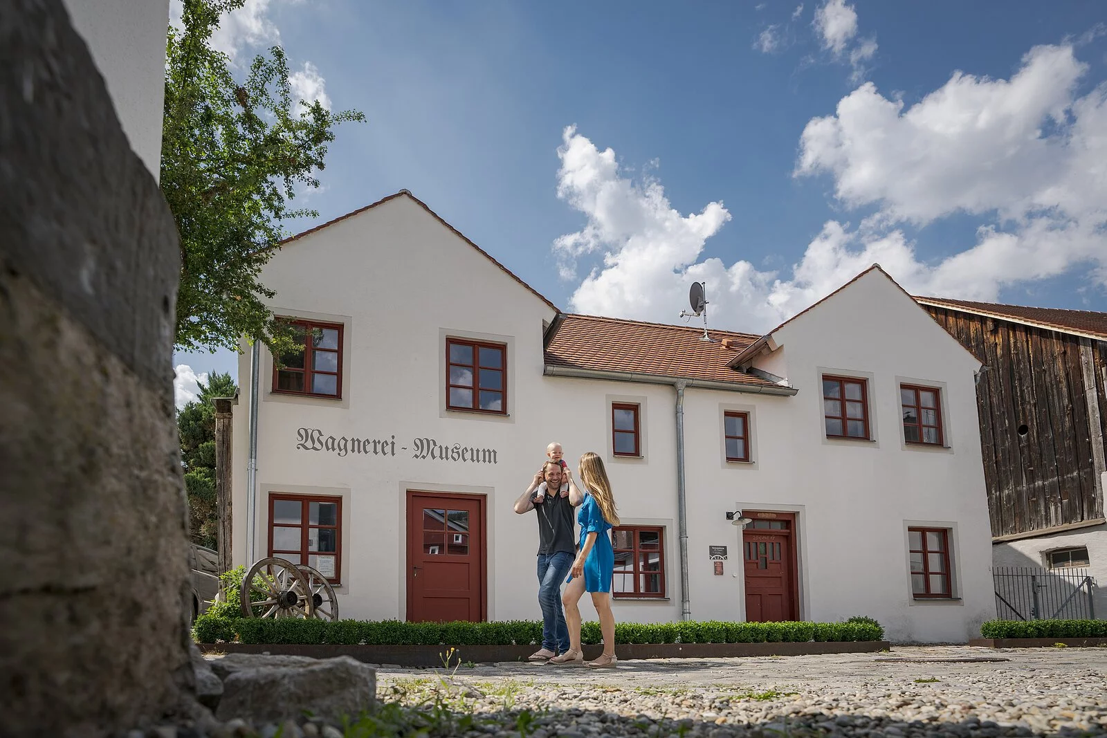 Wagnerei-Museum in Dietfurt an der AltmühlZwei Personen stehen an einem Brunnen in einer bunten Stadtumgebung.Kreuzberg