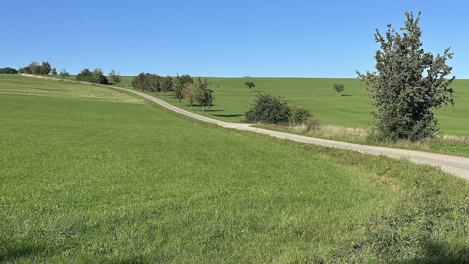 Zurück in Richtung Langenaltheim schlängelt sich der Weg wieder durch ein liebliches Tal hinauf. Zu beiden Seiten des Weges sieht man nun immer öfter übermooste Felsen im Wald. Nach einiger Zeit öffnet sich der Wald zur Linken und das Wittesheimer Windrad erscheint hinter Äckern und Wiesen. Bei ausreichender Schneelage präpariert der örliche Skiclub im Winter hier eine Skipiste und betreibt einen mobilen Schlepplift. Von hier könnten wir die Runde abkürzen und direkt zum Wanderparkplatz an der alten Eiche zurückkehren (nach rechts in Wald abbiegen und steil bergauf auf unbeschildertem Forstweg). Wir aber halten uns links und bleiben auf dem Weg zunächst am Waldrand entlang, bevor wir stets sanft bergan durch den Wald und zuletzt durch Wiesen und Äcker zum höchsten Punkt der Wanderung kurz vor dem Ortseingang gelangen. Hier bietet sich nochmal ein schöner Rundumblick bevor wir durch den Ort zurück zum Ausgangspunkt gelangen.