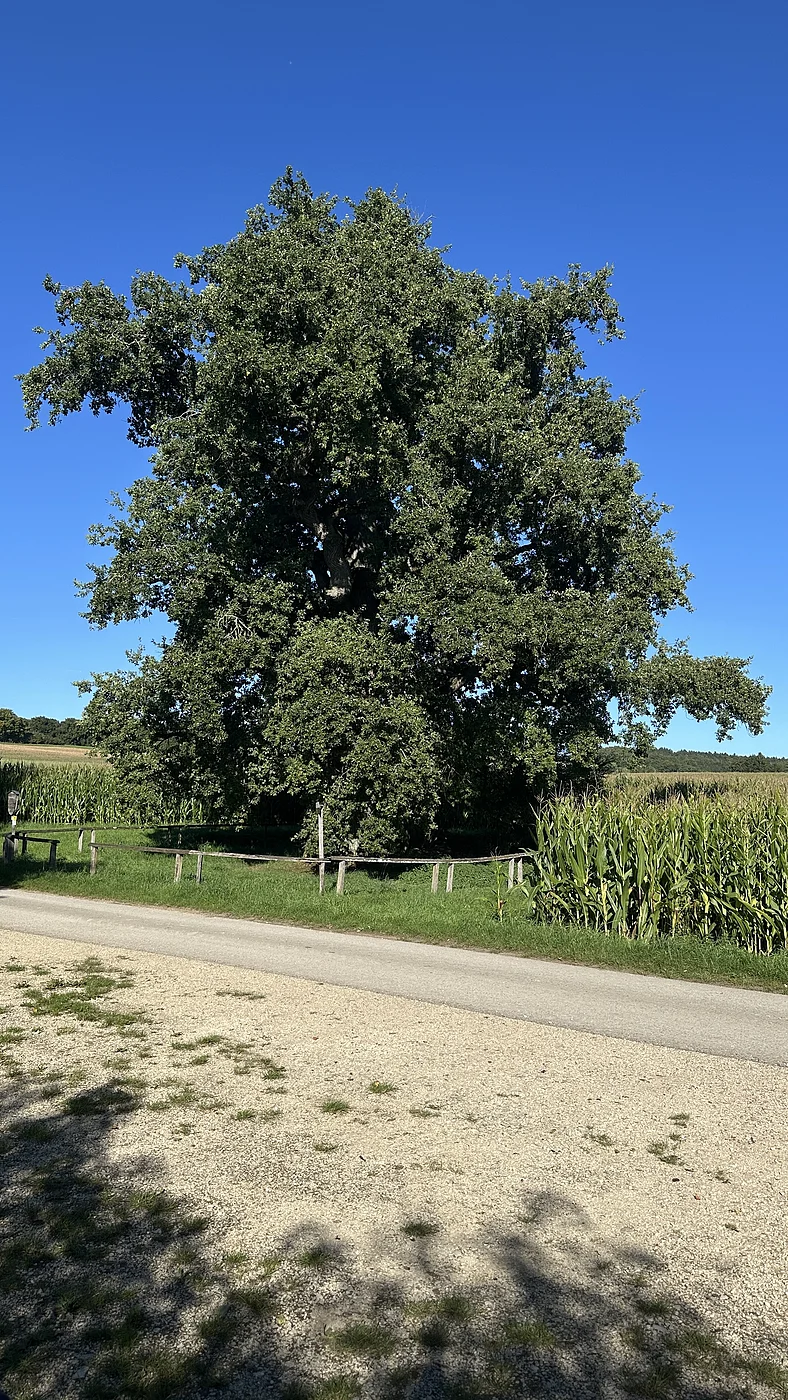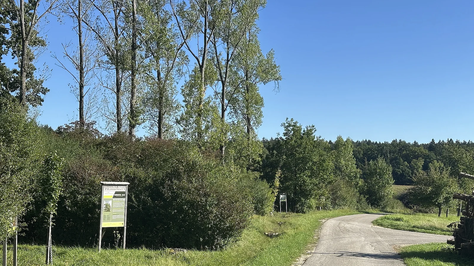 Wir verlassen Langenaltheim südwärts und gelangen zunächst zum Aussichtspunkt Langenaltheimer Höhe. Bei entsprechender Wetterlage reicht der Blick bis zu den Alpen! Nun geht's bergab, vorbei an der neu angelegten Baumartenallee zum Naturdenkmal "Uralte Eiche". Der hier gelegene Wanderparkplatz bietet sich als alternativer Start-/Zielpunkt für eine verkürzte Runde an. Lohnenswert ist ein kurzer Abstecher nach rechts zum in Sichtweite gelegenen und liebevoll restaurierten Krauthaus, wo man eine gemütliche erste Pause einlegen kann. Frisch gestärkt lassen wir diesen imposanten Baum hinter uns und biegen nach links ab, wo uns der Weg ein Stück am Waldrand entlang führt, um dann nach kurzer Zeit in den einsamen Wald abzubiegen. Nach ein paar hundert Metern trifft man auf eine Weggabelung, die nach knapp 100 Metern zu einem Keltengrab aus der Zeit um 500 vor Christus führt. Nach diesem kurzen, aber ebenfalls lohnenden Abstecher führt der Weg weiter durch den Wald bis er nach ca. 2 km am "Schrannental" wieder dem Waldrand entlang folgt. Ein steinerner Tisch mit Bänken am Wegesrand verführt zu einem Picknick in der stillen Natur. Unten im Tal angekommen biegen wir rechts ab und wir gelangen auf einem Fahrradweg nach ca. 700 Metern direkt zum Dreiländereck. Nach starken Regenfällen und bei der Schneeschmelze im Frühjahr kann es schon mal vorkommen, dass die Furt im Tal überflutet ist. Wenn eine Überquerung nicht möglich ist, führt alternativ auf der Nordseite auch ein wilder Waldpfad entlang bis zum Dreiländereck (mit Kinderwagen nicht begehbar). Die Infotafel gibt hier ausführlich Auskunft zu diesem historischen Grenzpunkt und die Bänke um das schöne Denkmal laden zu einer längeren Pause und einem Schwätzchen mit Gleichgesinnten ein, denn dieser Punkt hat sich als geselliger Pausenplatz etabliert. Auch dank der großen Fichte unter der man gut geschützt ist bei Sonne und Regen.
