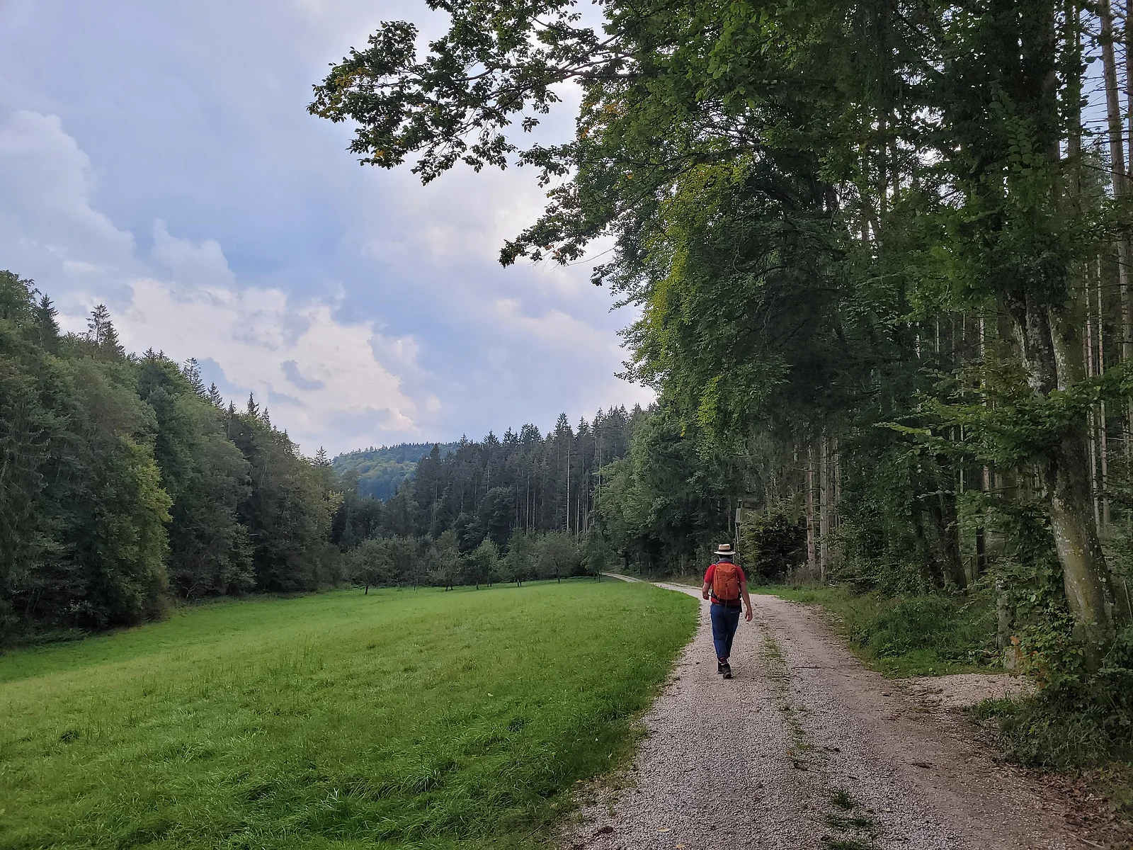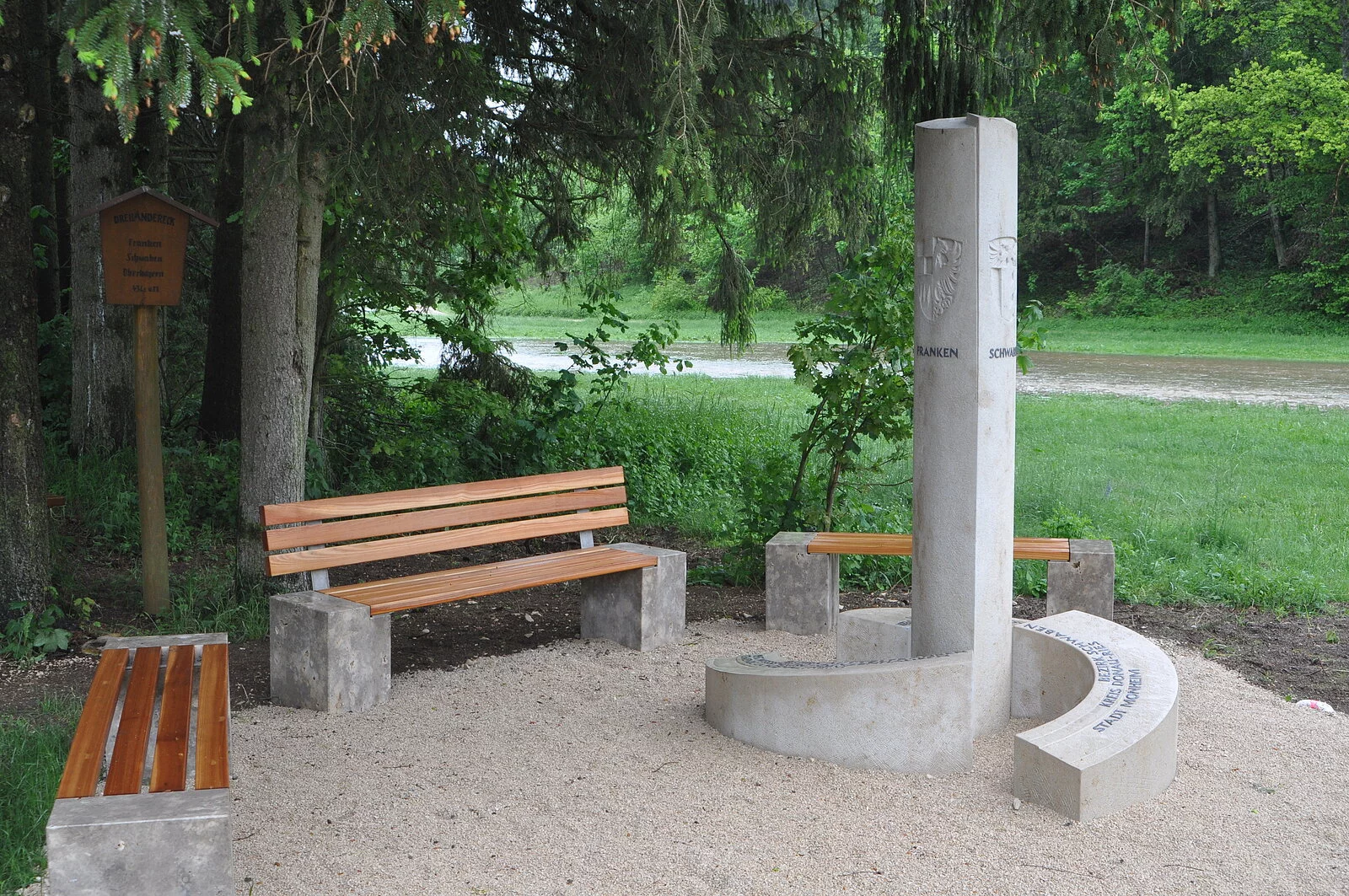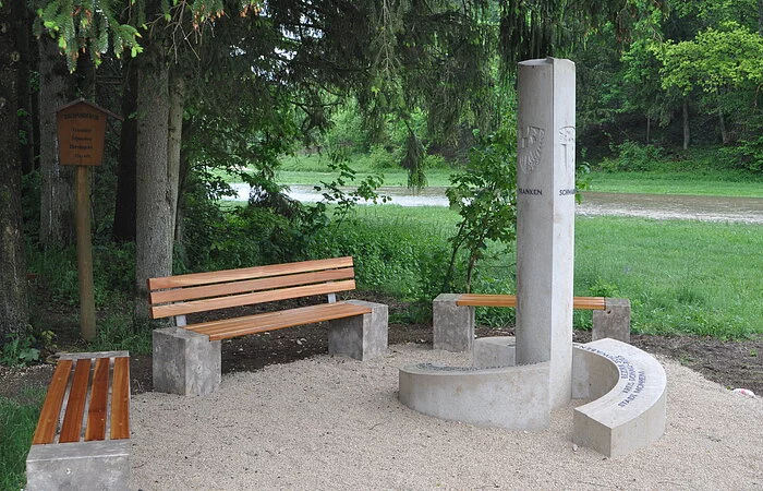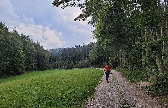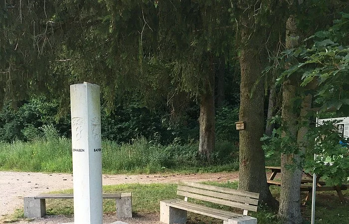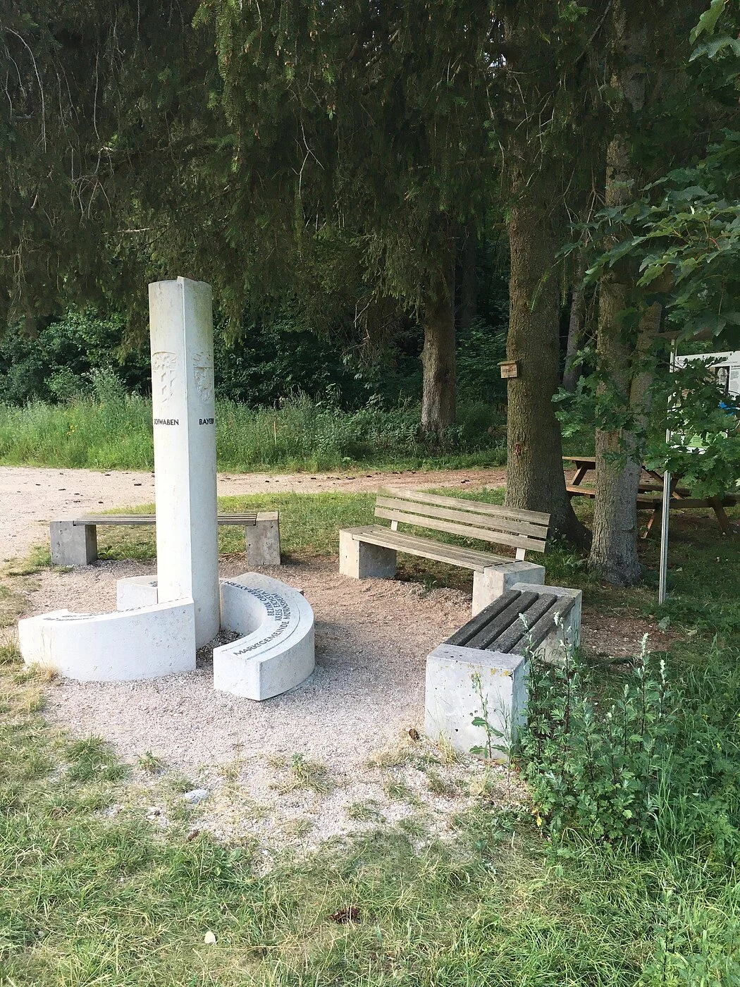 Wir verlassen Langenaltheim südwärts und gelangen zunächst zum Aussichtspunkt Langenaltheimer Höhe. Bei entsprechender Wetterlage reicht der Blick bis zu den Alpen! Nun geht's bergab, vorbei an der neu angelegten Baumartenallee zum Naturdenkmal "Uralte Eiche". Der hier gelegene Wanderparkplatz bietet sich als alternativer Start-/Zielpunkt für eine verkürzte Runde an. Lohnenswert ist ein kurzer Abstecher nach rechts zum in Sichtweite gelegenen und liebevoll restaurierten Krauthaus, wo man eine gemütliche erste Pause einlegen kann. Frisch gestärkt lassen wir diesen imposanten Baum hinter uns und biegen nach links ab, wo uns der Weg ein Stück am Waldrand entlang führt, um dann nach kurzer Zeit in den einsamen Wald abzubiegen. Nach ein paar hundert Metern trifft man auf eine Weggabelung, die nach knapp 100 Metern zu einem Keltengrab aus der Zeit um 500 vor Christus führt. Nach diesem kurzen, aber ebenfalls lohnenden Abstecher führt der Weg weiter durch den Wald bis er nach ca. 2 km am "Schrannental" wieder dem Waldrand entlang folgt. Ein steinerner Tisch mit Bänken am Wegesrand verführt zu einem Picknick in der stillen Natur. Unten im Tal angekommen biegen wir rechts ab und wir gelangen auf einem Fahrradweg nach ca. 700 Metern direkt zum Dreiländereck. Nach starken Regenfällen und bei der Schneeschmelze im Frühjahr kann es schon mal vorkommen, dass die Furt im Tal überflutet ist. Wenn eine Überquerung nicht möglich ist, führt alternativ auf der Nordseite auch ein wilder Waldpfad entlang bis zum Dreiländereck (mit Kinderwagen nicht begehbar). Die Infotafel gibt hier ausführlich Auskunft zu diesem historischen Grenzpunkt und die Bänke um das schöne Denkmal laden zu einer längeren Pause und einem Schwätzchen mit Gleichgesinnten ein, denn dieser Punkt hat sich als geselliger Pausenplatz etabliert. Auch dank der großen Fichte unter der man gut geschützt ist bei Sonne und Regen.
