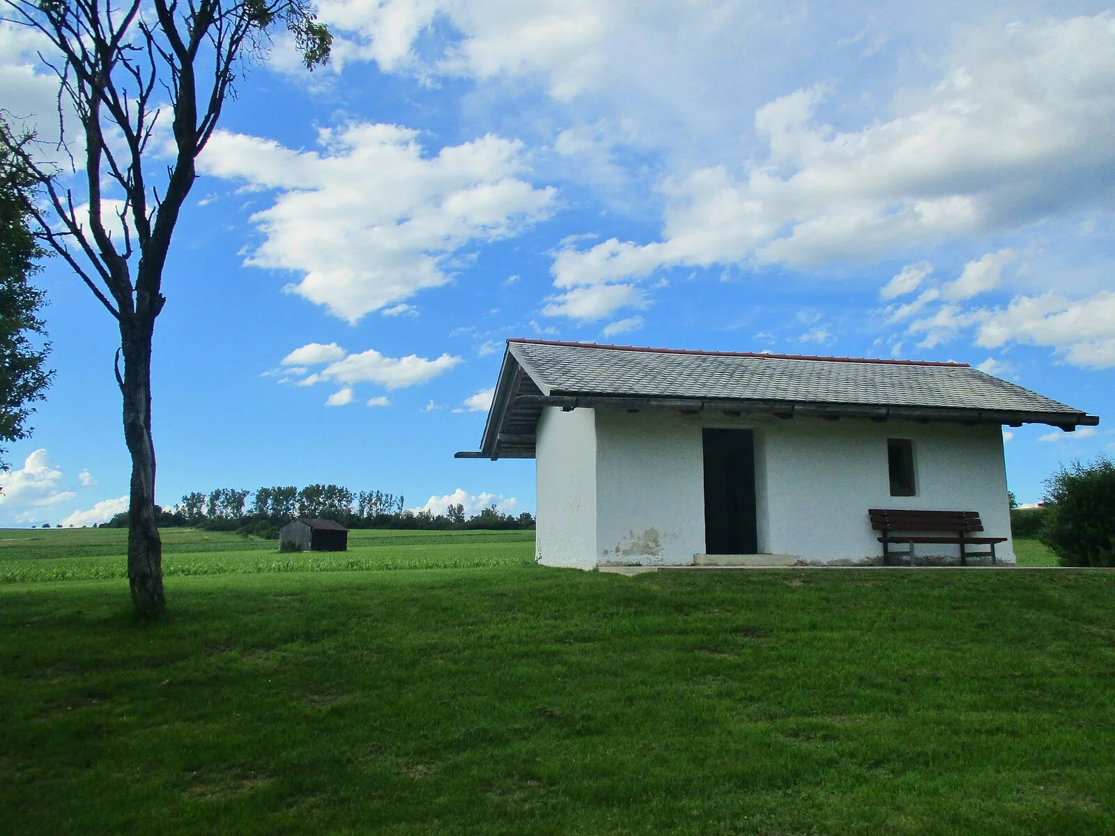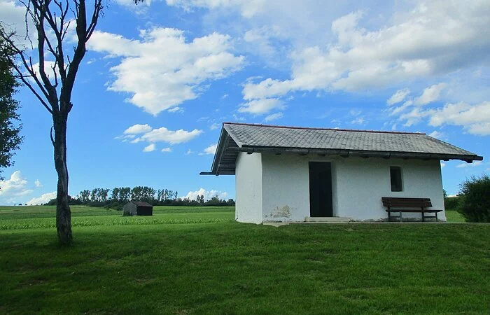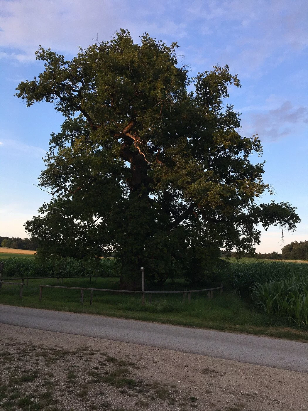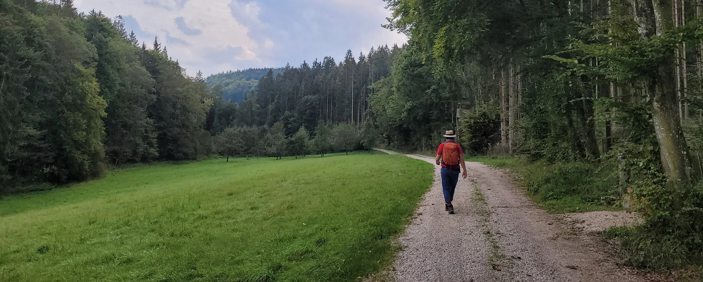 Wir verlassen Langenaltheim südwärts und gelangen zunächst zum Aussichtspunkt Langenaltheimer Höhe. Bei entsprechender Wetterlage reicht der Blick bis zu den Alpen! Nun geht's bergab, vorbei an der neu angelegten Baumartenallee zum Naturdenkmal "Uralte Eiche". Der hier gelegene Wanderparkplatz bietet sich als alternativer Start-/Zielpunkt für eine verkürzte Runde an. Lohnenswert ist ein kurzer Abstecher nach rechts zum in Sichtweite gelegenen und liebevoll restaurierten Krauthaus, wo man eine gemütliche erste Pause einlegen kann. Frisch gestärkt lassen wir diesen imposanten Baum hinter uns und biegen nach links ab, wo uns der Weg ein Stück am Waldrand entlang führt, um dann nach kurzer Zeit in den einsamen Wald abzubiegen. Nach ein paar hundert Metern trifft man auf eine Weggabelung, die nach knapp 100 Metern zu einem Keltengrab aus der Zeit um 500 vor Christus führt. Nach diesem kurzen, aber ebenfalls lohnenden Abstecher führt der Weg weiter durch den Wald bis er nach ca. 2 km am "Schrannental" wieder dem Waldrand entlang folgt. Ein steinerner Tisch mit Bänken am Wegesrand verführt zu einem Picknick in der stillen Natur. Unten im Tal angekommen biegen wir rechts ab und wir gelangen auf einem Fahrradweg nach ca. 700 Metern direkt zum Dreiländereck. Nach starken Regenfällen und bei der Schneeschmelze im Frühjahr kann es schon mal vorkommen, dass die Furt im Tal überflutet ist. Wenn eine Überquerung nicht möglich ist, führt alternativ auf der Nordseite auch ein wilder Waldpfad entlang bis zum Dreiländereck (mit Kinderwagen nicht begehbar). Die Infotafel gibt hier ausführlich Auskunft zu diesem historischen Grenzpunkt und die Bänke um das schöne Denkmal laden zu einer längeren Pause und einem Schwätzchen mit Gleichgesinnten ein, denn dieser Punkt hat sich als geselliger Pausenplatz etabliert. Auch dank der großen Fichte unter der man gut geschützt ist bei Sonne und Regen.