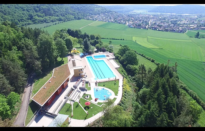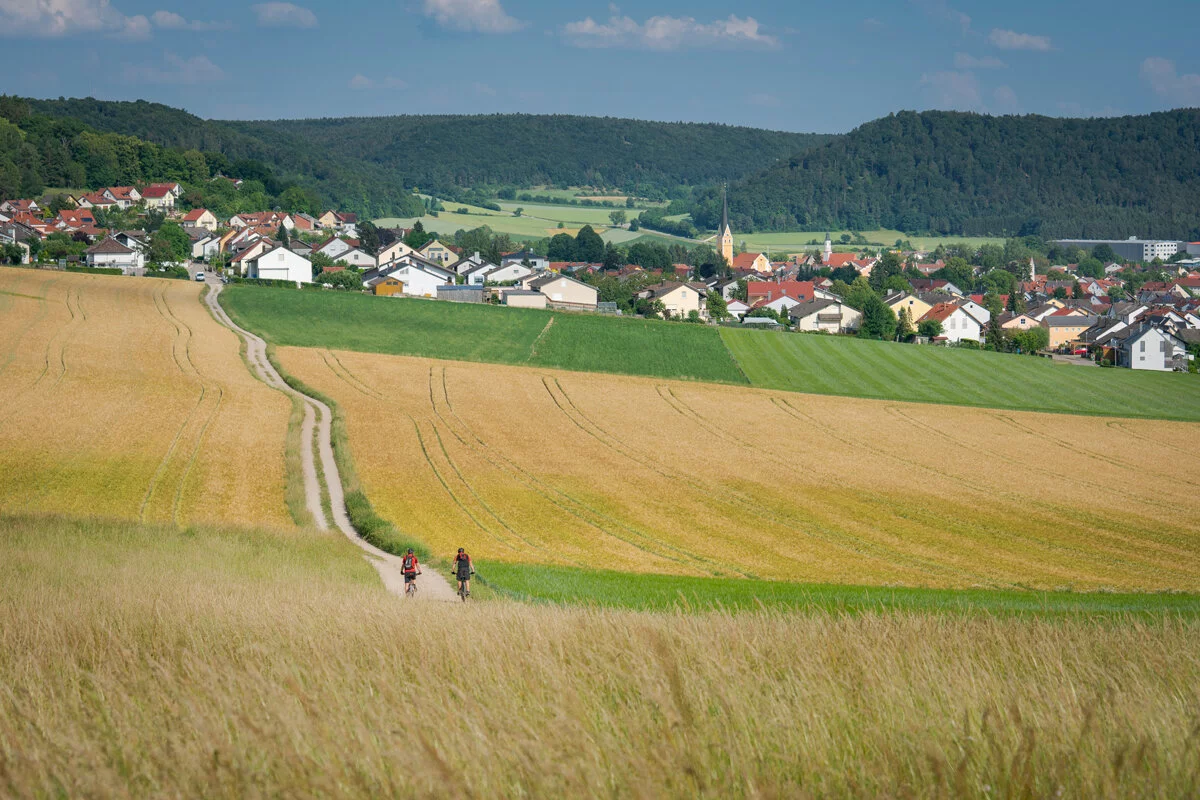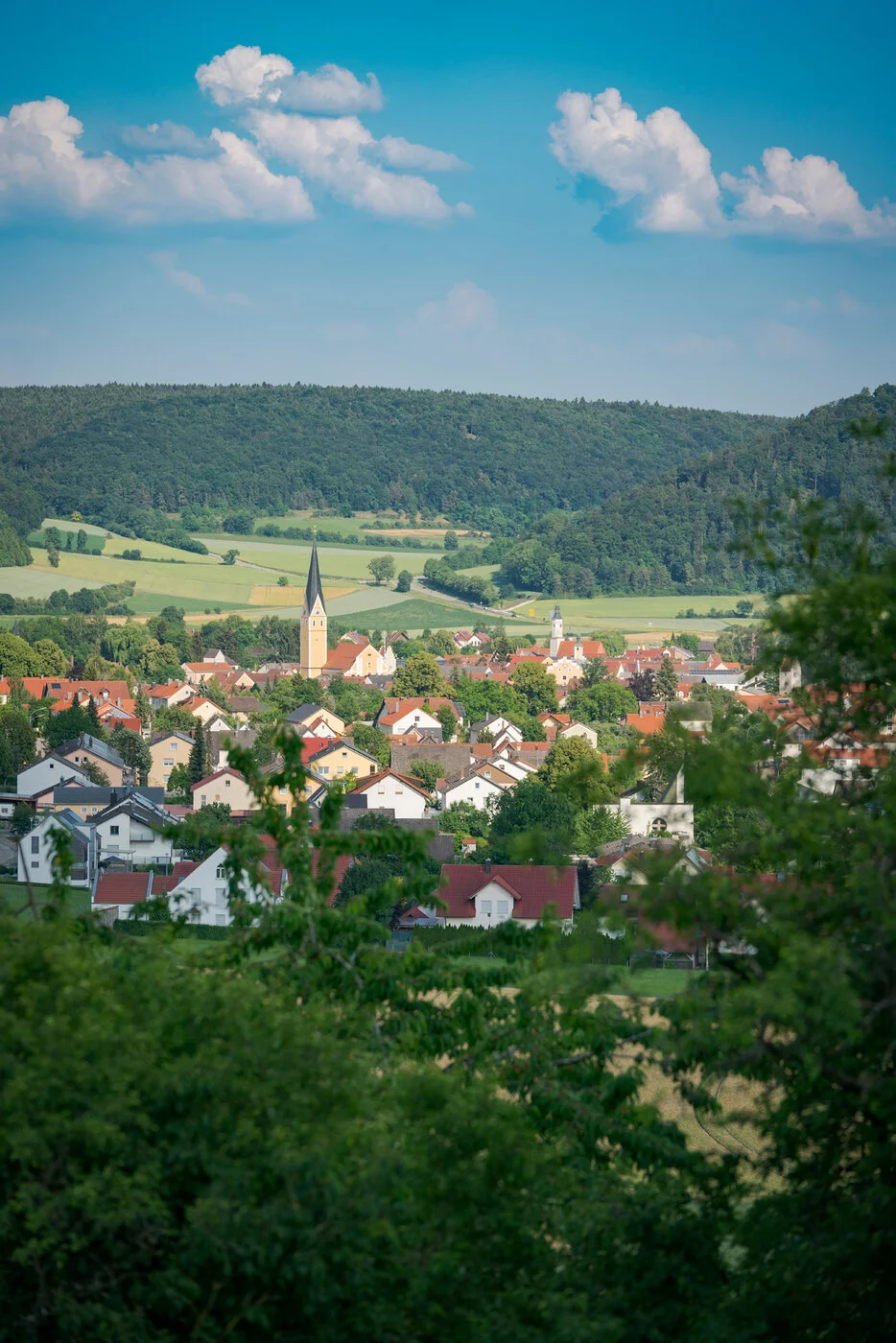 Jetzt wandern wir an der Sommerleite entlang Richtung Dietfurt, das Ottmaringertal im Blick. Nach ca. 2 km gehen wir durch ein kleines lichtes Waldstück, überqueren die Straße nach Mallerstetten und nach einem kurzen Anstieg erreichen wir das 7-Täler-Panoramabad. Danach führt uns der Weg weiter auf einem Feldweg zurück nach Dietfurt. Über die Weinbergstraße gelangen wir wieder auf die Kellergasse und danach zu unserem Ausgangspunkt.