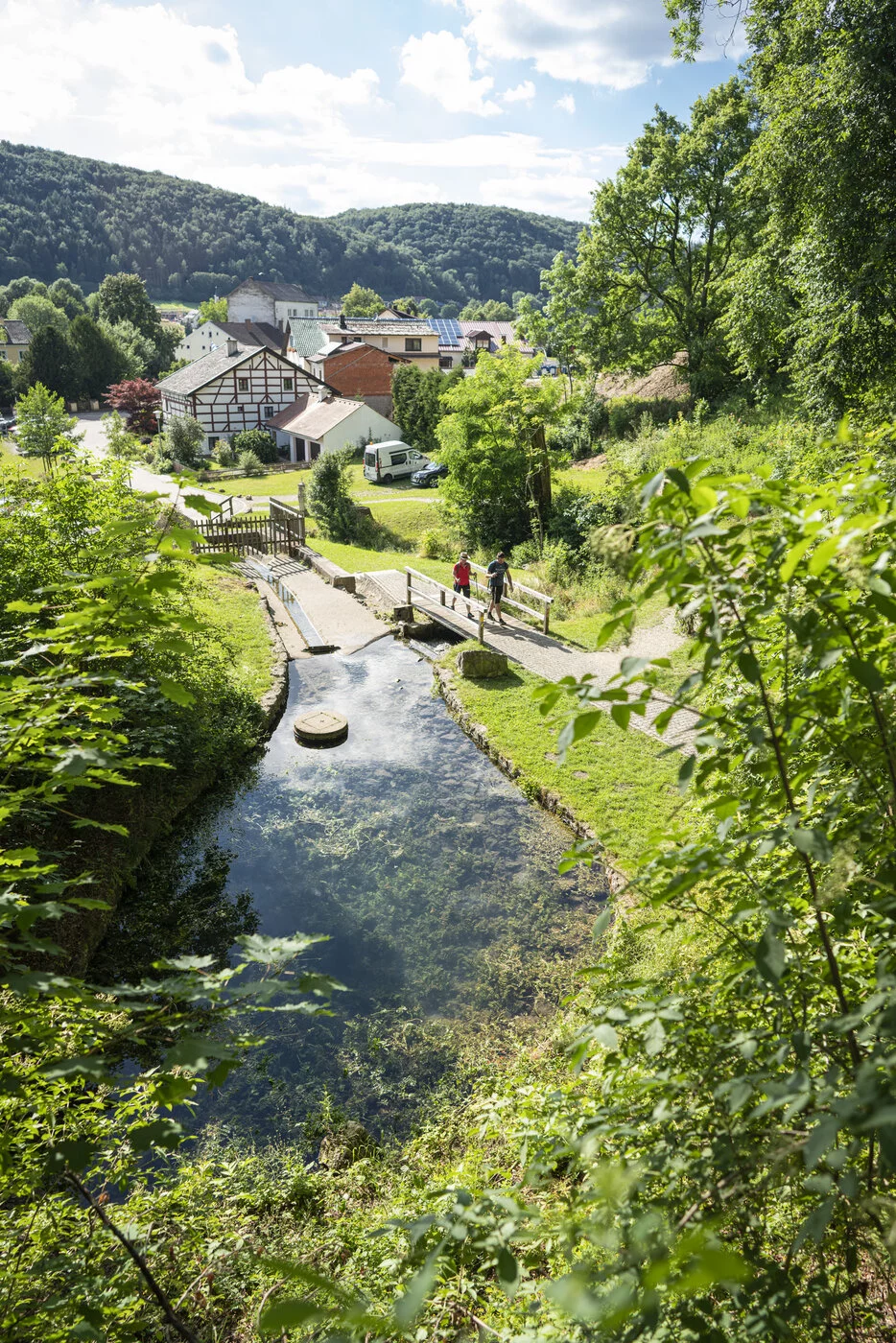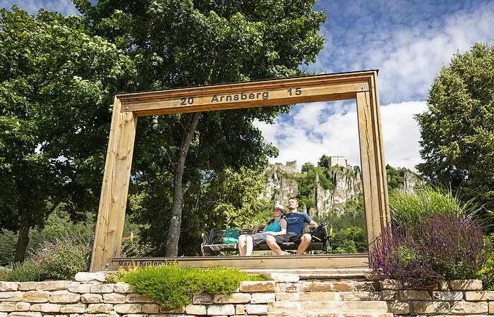 Der Weg führt uns weiter Richtung Norden auf größtenteils schmalen Pfaden und vorbei an beeindruckenden Felsen zur Karstquelle "Grüner Topf" in Grösdorf, das wir nach 1,5 km erreichen. Durch den Ortsteil (Einkehrmöglichkeit) und Engelgrösdorf auf der anderen Seite der Altmühl (Westufer) leitet uns die gut beschilderte Strecke zum Anschluss auf den Altmühltal-Panoramaweg, auf dem wir unseren Ausgangs- und Zielort Arnsberg erreichen.