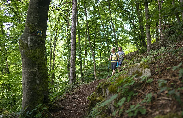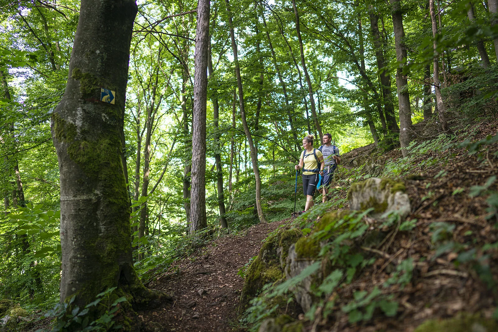 Anschließend erreichen wir auf einem leicht abfallenden Pfad einen Wiesenweg, der schon bald auf einen breiten Forstweg trifft. Von diesem zweigen wir nach ca. 1 km auf einen Waldweg ab, der oberhalb des Birktals bis nach Kipfenberg führt. Auf dem "Husarensteig", später "Plazottasteig", schmalen Steigen, die an Felsen geschmiegt sind, kreuzen wir die Route des Ostaufstiegs zum Michelsberg, genießen auf der Aussichtsplattform einen tollen Blick ins Birktal mit seinen Wacholderbüschen und gehen weiter talwärts bis zum Parkplatz im Birktal.