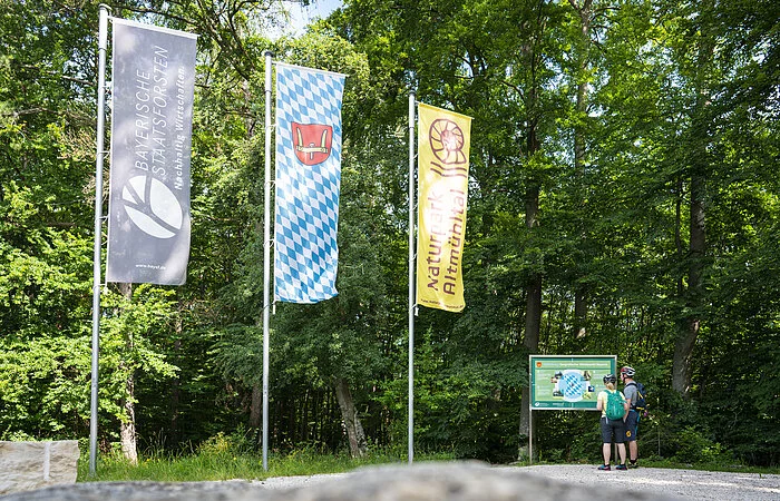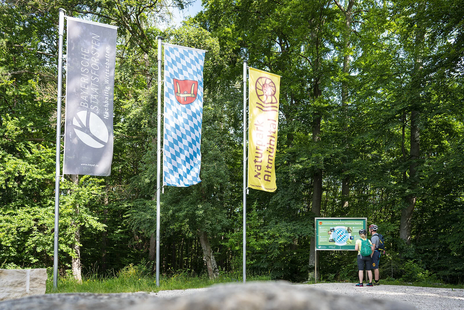 Wir überqueren die Hauptstraße und gelangen über einen steilen Anstieg (und teilweise parallel zum Kressensteig - Wanderweg 3) zur Burg Kipfenberg mit dem Römer und Bajuwaren Museum mit dem Infopoint Limes (ca. 20 min.) und weiter zum geografischen Mittelpunkt Bayerns (ab Museum ca. 10 min.). Von dort wandern wir über die Limeshütte auf einem serpentinenartigen Waldpfad talwärts. Der Weg stoppt leicht oberhalb Kipfenbergs an der evangelischen Kirche (Einkehrmöglichkeiten am Marktplatz in 200 m Entfernung).