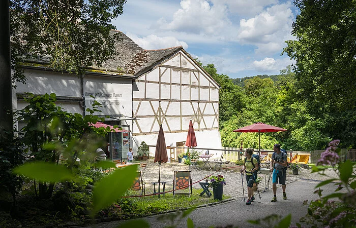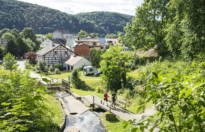 Wir starten unsere Tour in Arnsberg am Parkplatz an der Altmühlbrücke. Von hier führt der Weg in Richtung Süden entlang der Altmühl. Wir überqueren die Straße (Staatsstraße), sehen rechts bereits die erste Mühle des Schambachtals (Böllermühle), lassen diese jedoch liegen und folgen der Straße (Böllermühlstraße) etwa weitere 300 m. Dann biegen wir nach rechts ab ("Zur Forstermühle"), queren die Schambach über eine kleine Brücke und sehen direkt vor uns die Freitagmühle. Entlang des mit Obstbäumen gesäumten Weges und vorbei an einer kleinen Kapelle marschieren wir rechts bis zum Waldrand. Hier steigt der Weg leicht an und bringt uns nach ca. 1 km zum Einstieg in den Rauchenbergersteig. Oberhalb der Schambach wandern wir an Felswänden vorbei, erhaschen tolle Blicke auf die Petermühle und das Tal und folgen dem Steig nach ca. 1 km abwärts. Wir kreuzen die Wanderwege 5, 6, 7 und 9, folgen der Beschilderung und gelangen, vorbei an Wiesen und der Helenenkapelle, die direkt an der Schambach liegt, zur Rothmühle, die wir rechts liegenlassen. Nach Überqueren der Schambach passieren wir den Gasthof. Diesen umrunden wir, bis wir die Straßenkreuzung erreichen. Dort angekommen besteht die Möglichkeit, noch zwei kurze Abstecher zu machen: linkerhand geht es zum Wassertretbecken (200 m) mit kleinem Spielplatz, rechterhand kommen wir zur Katholischen Wallfahrtskirche "Heilig Kreuz" (200 m) sowie zur Biberplattform (1 km) etwas außerhalb des Ortes.