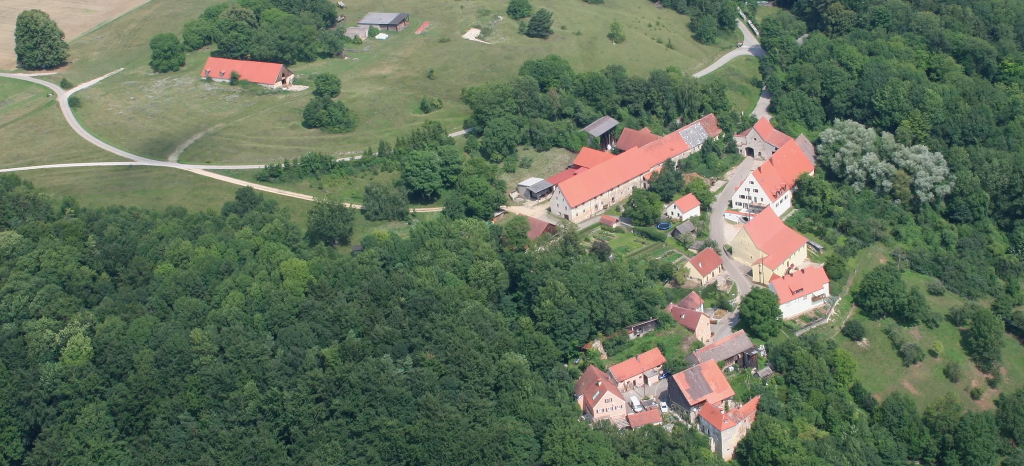 Hier besteht die Möglichkeit an der dortigen Wandertafel einen kurzen Abstecher von nur ca. 50 m zur Besichtigung der Burgruine Hofberg zu unternehmen. Wir wenden uns an der Wandertafel nach rechts und verlassen den Ortsteil Hofberg über die asphaltierte Straße durch das große gemauerte Eingangstor. (Hier wurde eine Gedenkstätte zum Bauernkrieg im Jahr 1525 errichtet. Denn die Burg Hofberg diente damals dem „Mässinger Haufen“ mit mehreren tausend Bauern als Basislager.)