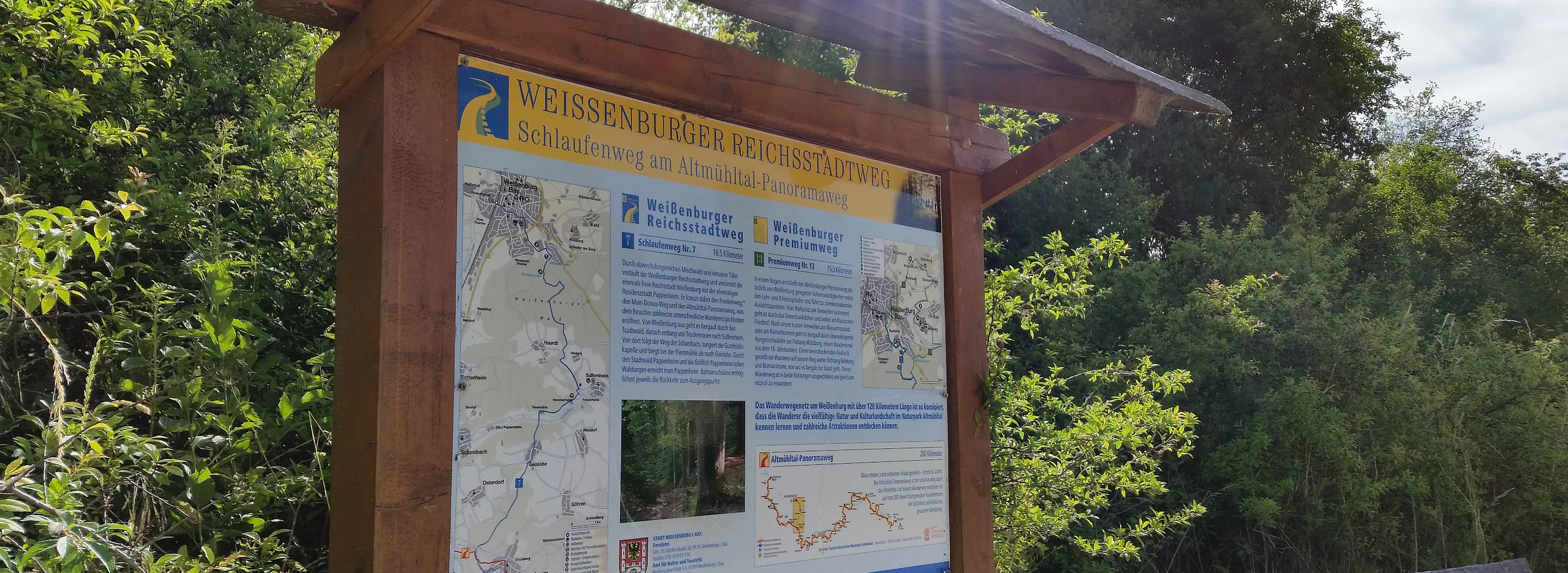 Unsere Tour beginnt am Bahnhof in Weißenburg. Wir gehen geradeaus zur großen Kreuzung und biegen in die alte Bundesstraße nach rechts - nicht scharf rechts - ab. Links an der Willibaldskirche vorbei, entlang des Seeweiherparkplatzes und an der Turnhalle bis zur Kreuzung. Hier rechts bergauf der Beschilderung folgend und die B2 auf der Brücke überqueren. Dann links durch das Dreieckswäldchen am Lehrpfad vorbei, anschließend links hinunter zum Naturlehrpfad Forellenweiher, von dem aus ein Weg zum Römerbrunnen und durch den Ludwigswald führt. Wir gehen an der Hangkante entlang nach links bis zur Forststraße, hier halten wir uns rechts bis zum Wanderparkplatz Thäleinschlag. Wir gehen nach rechts und erreichen nach 400m den Wanderparkplatz Haselespan. Wir folgen der Beschilderung auf der Forststraße bis in die Talsenke. Hier gehen wir rechts durch den Wald bis zur Wiese. Am Waldrand entlang erreichen wir Trockenrasen und gehen im Talgrund entlang der Heckenreihe bis zum Wanderparkplatz Suffersheim. Hier lohnt sich ein Abstecher nach Suffersheim, das im Tal zwischen Wald und Heiden liegt. Auf der Hauptroute geht es hinter dem "Waldhof" auf dem Gunthildisweg entlang Richtung Westen zum "Schneckenhaus Gottes", einer 1995 eingeweihten Kapelle. Wir gehen die Schambach entlang bis zur Flemmmühle. Hier halten wir uns links, gehen über die Straße und geradeaus nach Geislohe. Den Ort durchqueren wir auf Fußwegen, lassen ihn auf Feldwegen hinter uns und gehen dirket auf den Wald zu. Wir durchqueren zunächst den Stadtwald Pappenheim und dann den Gräflichen Pappenheimischen Wald. So erreichen wir Pappenheim. Der Weg führt uns steil den Berg hinab. Wir biegen rechts in die Bürgermeister-Rukwid-Straße ein, gehen links am Campingplatz vorbei und links entlang der Altmühl zum Parkplatz an den Stadtwerken. Von hier trennen uns nur wenige Meter vom Pappenheimer Marktplatz. Wo die Hauptstraße nach rechts biegt, gehen wir geradeaus und gleich rechts in den Fußweg. Nach dem Unterqueren einer Hochstraße geht es links zum Bahnhof Pappenheim.