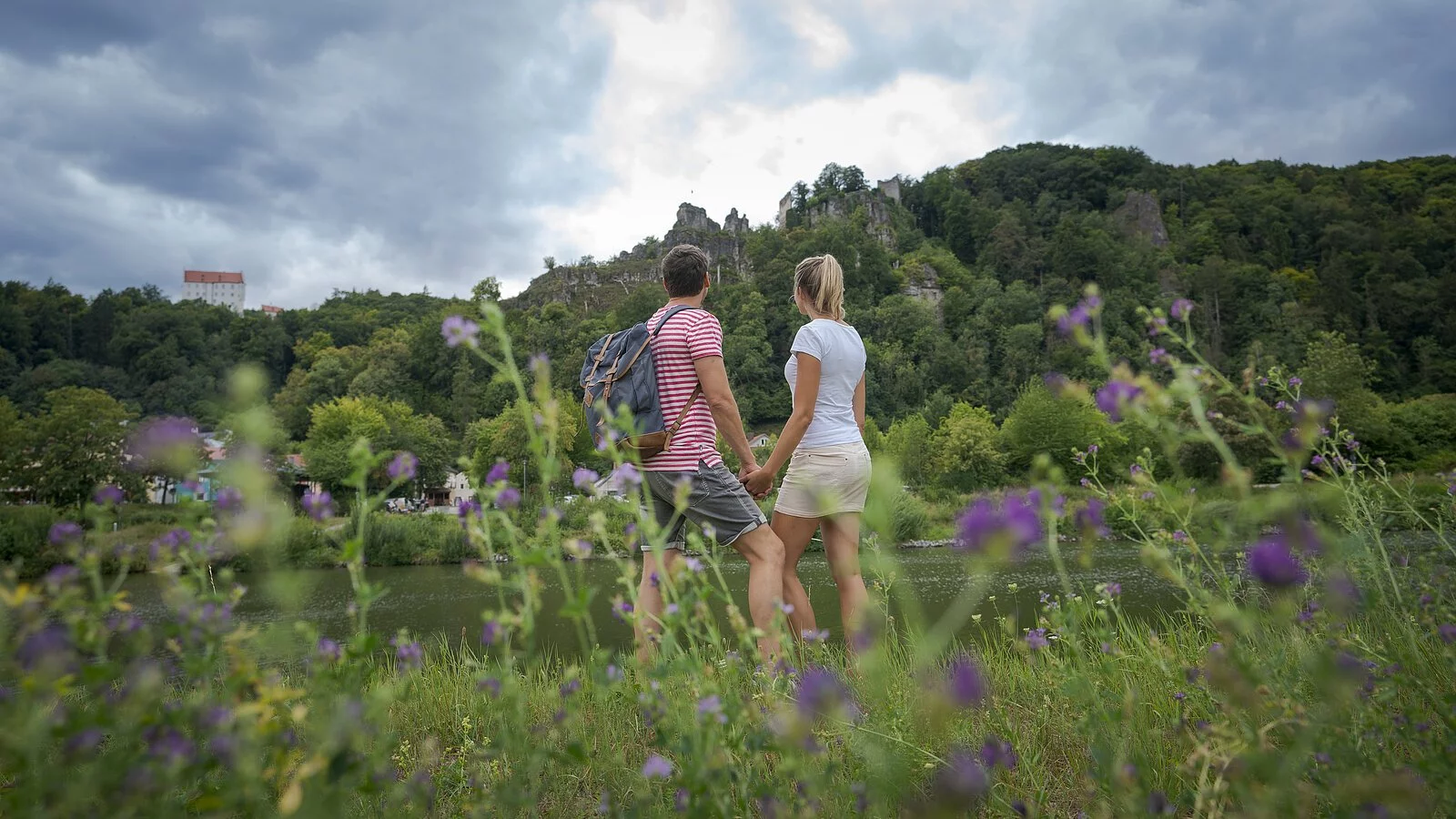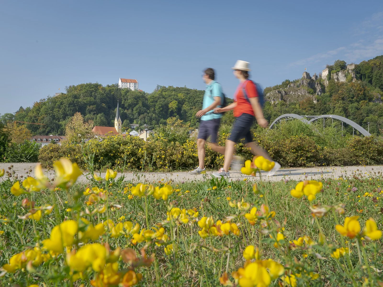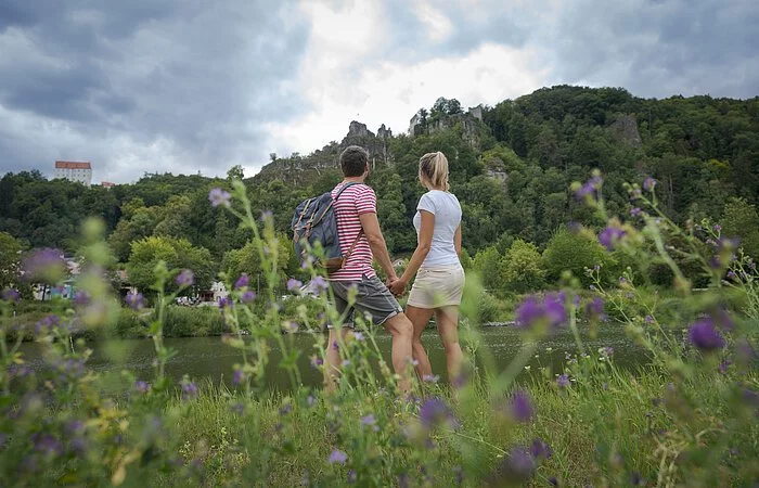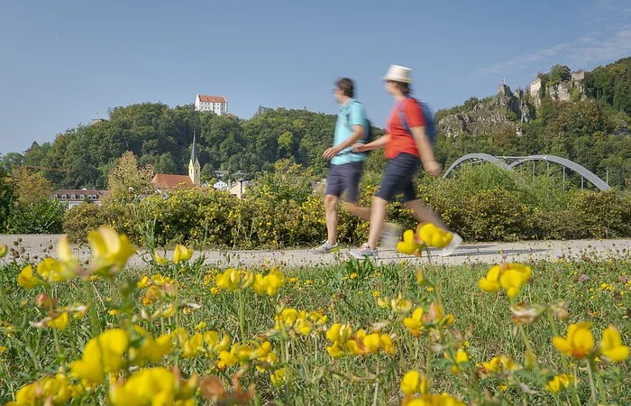 Ihre Wanderung beginnt an der Tourist-Information Riedenburg und führt zunächst über die Stadtbrücke weiter auf dem Jachenhausener Weg bis zur Station 11 des Riedenburger Klangweges, ab hier folgen Sie dem Klangweg bergauf in Richtung des Wanderparkplatzes am "Trimm-Dich-Pfad und wandern rechts entlang des Waldrandes bis zum "Emmerthalergrund". Wir wandern links am Steinbruch vorbei und weiter durch das schöne Trockental bis zur Straße nach Hattenhofen. Diese überqueren wir und umwandern den Ortsteil Ried bis wir zur Verbindungsstraße Schaitdorf - Ried gelangen, die wir überqueren. Nach ca. 300m halten wir uns rechts und erreichen über die leichte Steigung durch die Waldflur Jachenhausen. Im Ort wandern wir auf der Unteren Dorfstraße zur Oberen Dorfstraße und weiter bis zur Kreisstraße. Wir überqueren diese und wandern weiter zum "Teufelsfelsen". Hier biegen wir auf den Altmühltal-Panoramaweg ein und erreichen so unseren Ausgangspunkt.