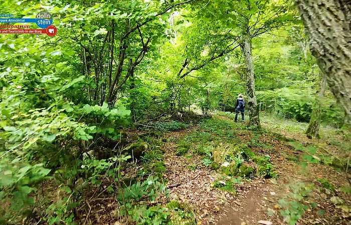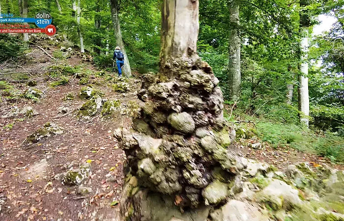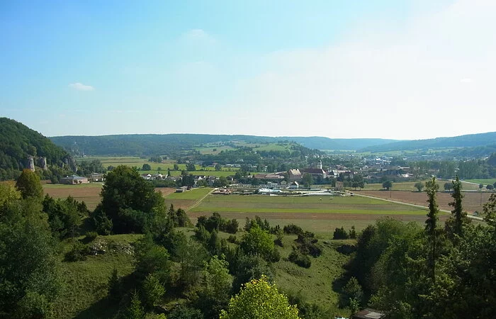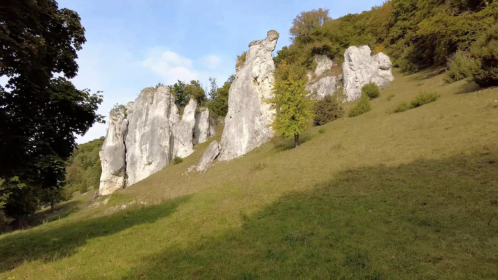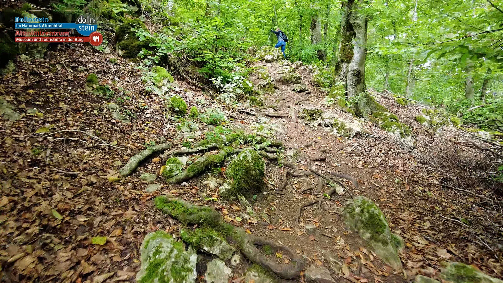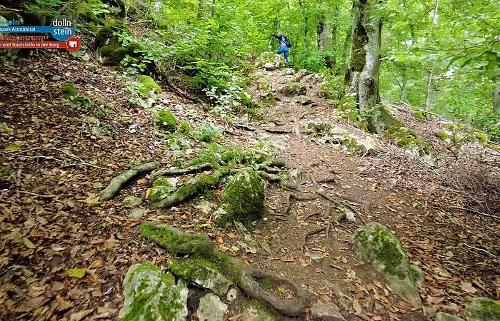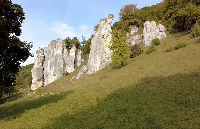 Anschließend steigen wir steil hinunter zum Burgstein (453 m), einem der schönsten Geotope Bayerns. An der Kapelle zum Burgstein folgt man dem Pfad nach rechts. Dort orientiert man sich flussaufwärts und wandert unterhalb von Trockenhängen und schroffen Kalkfelsen den schönen Fußweg entlang. Anschließend treffen wir wieder auf den Maderfelsen und wandern auf dem bereits bekannten Weg zum Ausgangspunkt zurück.