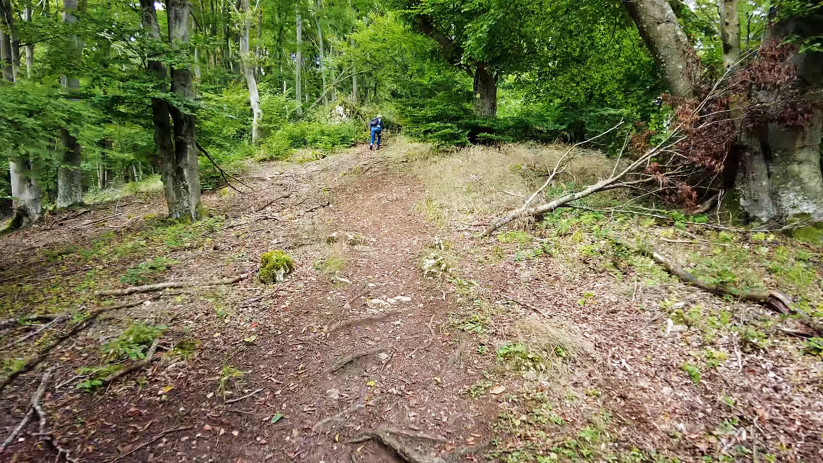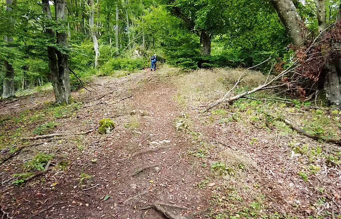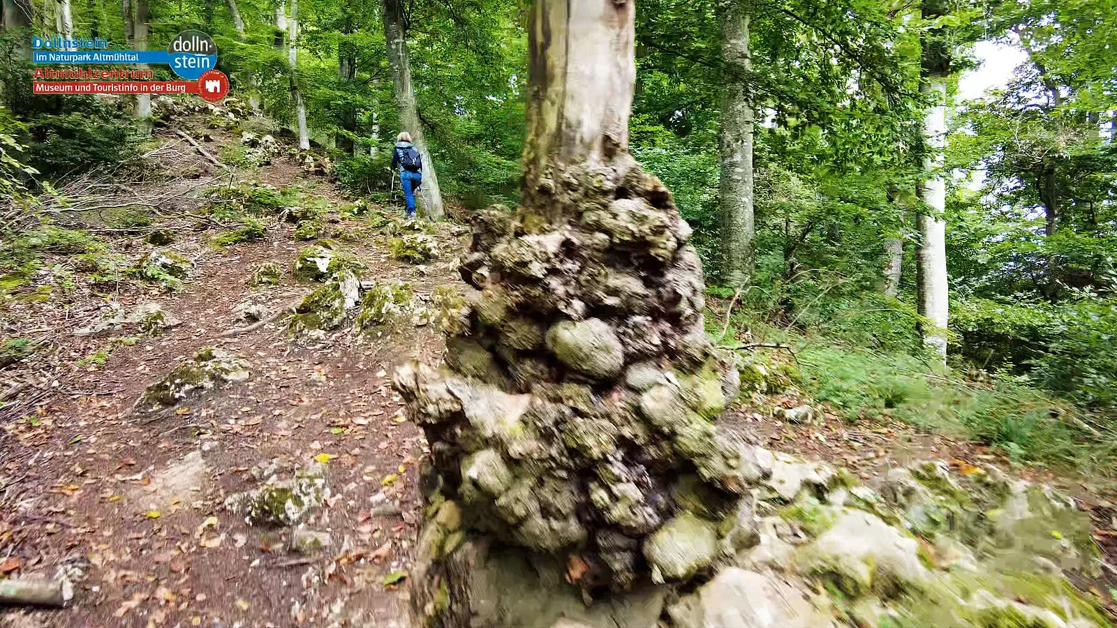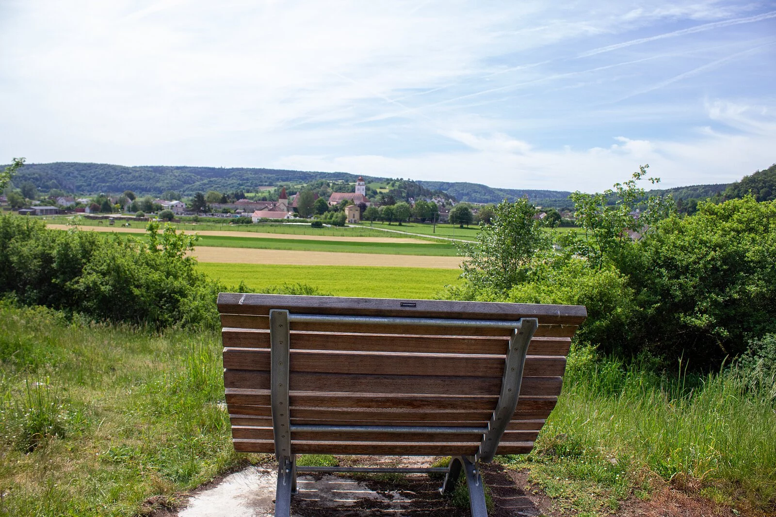An der nächsten Kreuzung halten wir uns rechts und wandern von nun an, mit einer größeren Steigung, den „Rossrücken“ bergauf. Hier lässt sich schon mal eine kleine Pause auf dem Waldsofa einlegen. Vom Bergkamm herrliche Aussicht ins Altmühl-, Urdonautal und auf den Markt Dollnstein. Im Wald geht es den Bergkamm entlang, vorbei am Funkturm, zum höchsten Punkt der Tour mit knapp 520 m.