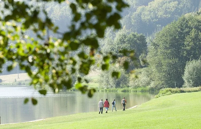 Ein Panoramaweg rund um Hechlingen und den idyllischen Hahnenkammsee. Idealer Ausgangspunkt ist der Parkplatz naben dem Landgasthof "Forellenhof" in der Unterhoferstraße. Wir gehen nach links, biegen anch rechts in die Schafgasse. Steil geht es den Berg hinauf, bevor wir bei der Tankstelle die Heidenheimer Straße überqueren. Nun wandern wir durch einen der schönsten Hohlwege im Hahnenkamm hinauf auf den 585 m hohen Kappelbuck. Mit einem herrlichen Blick auf den Hahnenkammsee, dem stattlichen Hahnenkammdorf Hechlingen am See und dem Ries (nur bei guter Fernsicht) werden wir nach dem Anstieg belohnt. Wir wandern in östliche Richtung, biegen an der Kreuzung nach rechts ab und verlassen den Schlaufenweg 3 Hahnenkamm. Nachdem wir die Landstraße überquert haben, erreichen wir den Wald und kurz darauf die Breitschlaghütte. Durch einen herrlichen Mischwald erreichen wir dne 528 m hohen Schlossberg. Hier befand sich eine Burganlage aus dem 11. Jahrhundert, vermutlich der Sitz der Herren von Stahelsberg. Ihre Nachfolger wurden die Herren von Truhendingen, Freigelegt wurden die Grundmauern einer Klosterkapelle. Sie gehören wohl zum Zisterzienserinnen-Kloster, das die Herren von Truhendingen um 1245 auf diesem Berg erbauen ließen. Wir steigen über Stufen den Steilhang hinab, überqueren die Landstraße und wandern rechts am Waldrand entlang zum Damm des Hahnenkammsees. Wir folgen dem westlichen Ufer des Landschaftssees und erreichen das Strandhaus mit Seegaststätte und Bootsanlegestelle. Am oberen Seeparkplatz gehen wir kurz ein Stück nach links, überqueren eine Landstraße und folgen einem Wirtschaftsweg. Oben angekommen liegt nördlich, vor uns wieder der staatlich anerkannte Erholungsort, Hechlingen am See. Zur rechten Seite erkennen wir die Hasenmühle und den Campingplatz. Links am großzügig angelegten Spielplatz vorbei, folgen wir dem Rohrachflüsschen bis zum Damwildgehege, überqueren eine Brücke und kommen zurück zu unserem Parkplatz beim Forellenhof.