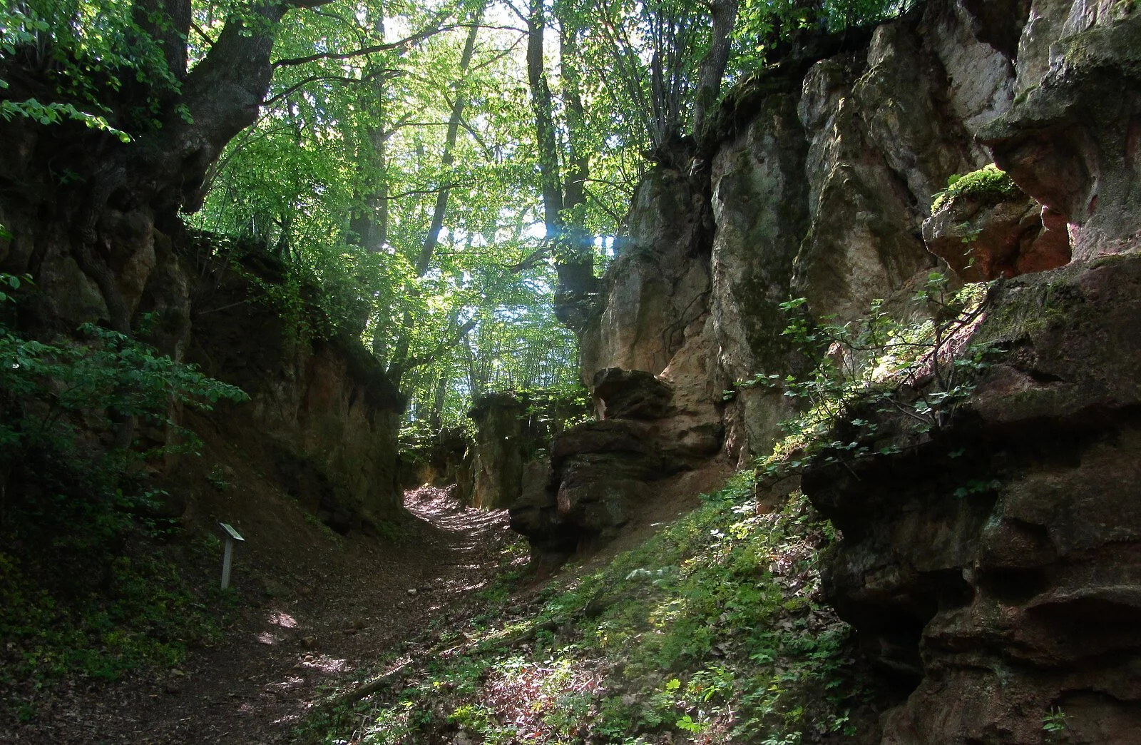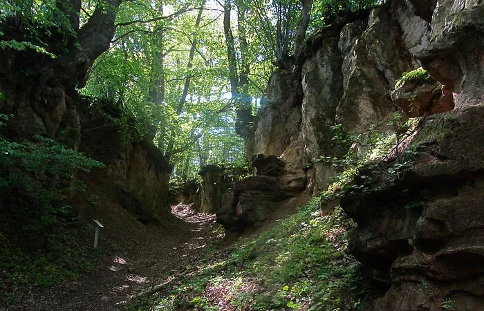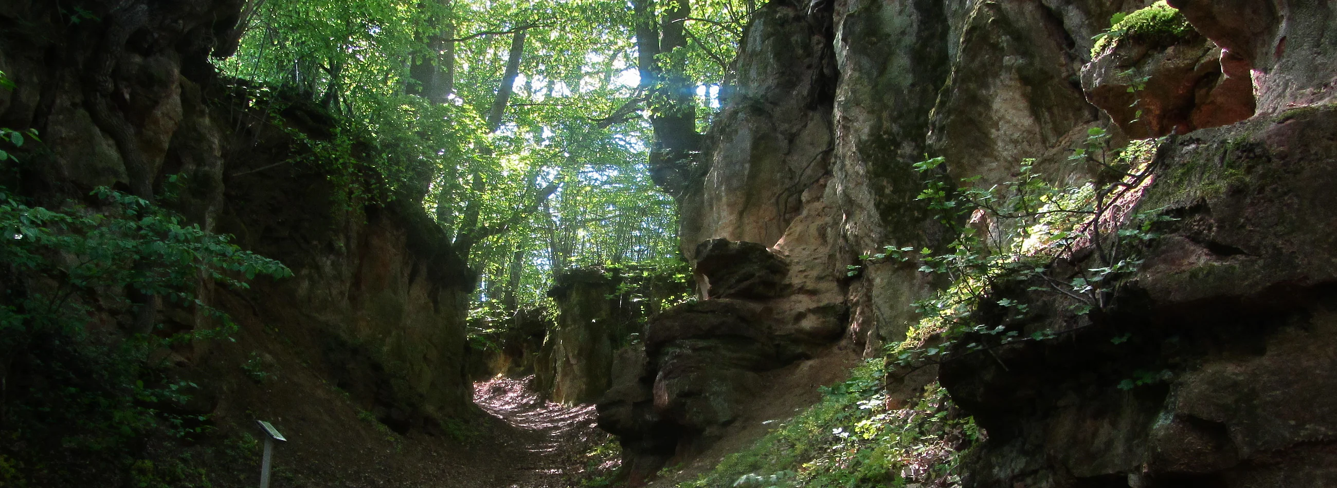 Der Parkplatz oberhalb (südlich) der Steinerne Rinne bei Wolfsbronn ist Ausgangspunkt unserer Wanderung. Zunächst wenden wir uns nach Westen, Richtung Heidenheim und überqueren die Kreisstraße 34 zwischen Wolfsbronn und Degersheim. Jetzt führt der Weg gemeinsam mit dem Schlaufenweg 3 und dem Quellenweg, der uns fast bis Hechlingen begleitet, ziemlich lange geradeaus, bis wir ein kleines Waldstück durchqueren. Nach der Schranke betreten wir den ehemaligen Übungsplatz der Bundeswehr, der sich auf der Hochfläche erstreckt. Wir wenden uns nach links und gehen im großen Bogen parallel zuerst zum Wald, dann zur Hecke. Der große Funkturm, der rechts am Dürrenberg sichtbar ist, markiert die höchste Erhebung des Hahnenkamms mit 656,4 m ü NN. Nach ungefähr einem Kilometer macht der Weg einen großen Rechtsbogen, an dessen Ende wir nach links über einen Trampelpfad den Übungsplatz verlassen, die Staatsstraße 2218 Heidenheim – Degersheim überqueren und uns dem Schullandheim zuwenden. Am Schullandheim vorbei, zwischen den Windrädern hindurch begleitet uns ein Stück der „Umwelterlebnispfad“ mit interessanten Stationen und einem überdachten Informations-Pavillion. Weiter geht’s durch den Wald hinunter nach Eggenthal. Vor dem Bauernhof führt der Weg links in den Wald Richtung Hechlingen am See. In der Nähe der Scheckenmühle treffen wir auf die Steinerne Rinne Hechlingen, die zu den eher kleineren Steinernen Rinnen gehört. Wir erreichen die Ortschaft Hechlingen. Hier besteht die Möglichkeit in den Forellenhof einzukehren und sich für die zweite Hälfte des Weges zu stärken. Auch als Ausgangspunkt für unseren Schlaufenweg 4 ist der Parkplatz vor dem Restaurant geeignet. Es geht wieder bergauf. Dabei treffen wir auf zwei Sehenswürdigkeiten, zunächst den Hechlinger Hohlweg, dann später auf der Höhe die St. Katharinen Kapelle, eine Ruine, erbaut ca. 1450. Durch den Wald wandern wir weiter über den Efferaberg zur landwirtschaftlich genutzten Hochfläche bei Degersheim. Hier treffen wir wieder auf die zahlreichen Windkraftanlagen. Wir durchqueren Degersheim und gelangen zum Altmühltal-Panoramaweg, dem wir nach links ca. 700 m zu unserem Ausgangspunkt folgen.