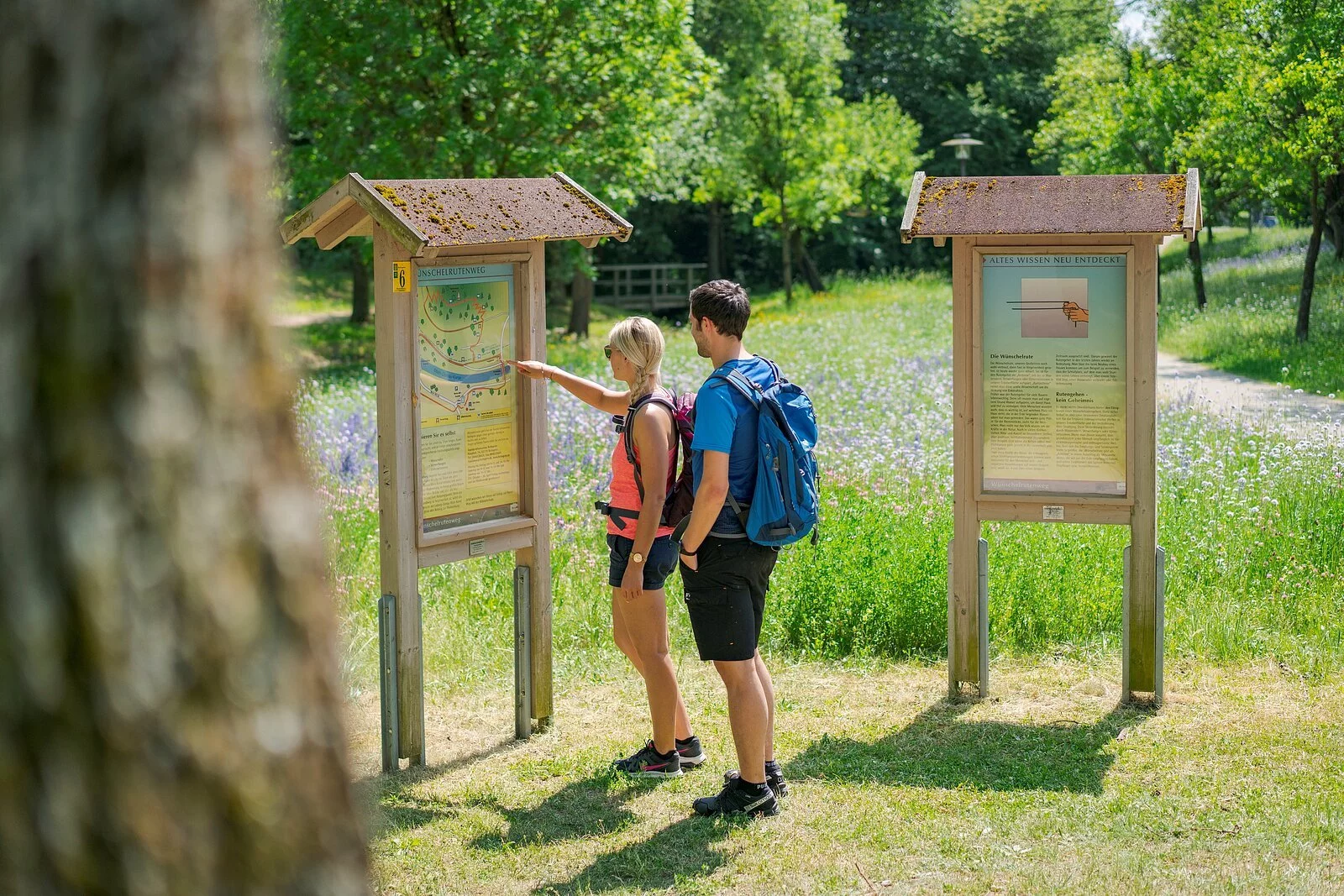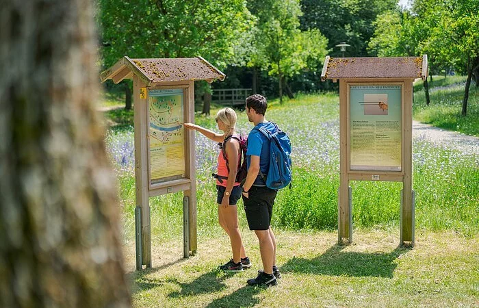 Ausgangspunkt der Tour ist das Haus des Gastes in Beilngries. Durch die Schneider-Peterle-Gasse verlässt man die Stadt und gelangt zum Fischlehrpfad, dem man bis zur Schiffsanlegestelle folgt. Weiter geht es ein Stück den Main-Donau-Kanal entlang, bis der Weg beim Sulzauslass links abzweigt und den Berg hinauf bis zur Marienklause mit der Marienkapelle führt. Danach geht es über die Straße und rein in den Buchenwald am Rande des Sichelbergs. Sobald man den Wald durchquert hat, kann man einen wunderschönen Blick auf Biberbach und das Benediktiner-Kloster Plankstetten genießen. Von hier aus startet der Abstieg nach Biberbach. In der Ortsmitte angekommen führt die Route bis zur Wehrkirche St. Michael und weiter auf die Straße Richtung Plankstetten. Der Straße folgt man ca. 200 m und biegt dann links ab. Der hier beginnende Waldweg führt direkt zum Benediktiner-Kloster Plankstetten. Durch den Klosterhof geht es weiter Richtung Berching. An der Talseite entlang führt der Weg über das Kruzerloch durch den naturnahen Buchenwald. Durch den Hochwald oberhalb von Eglasmühle folgt man dem Weg bis zur Weggabelung. Hier leitet der Wegweiser weiter in Richtung Schleuse Berching bis zum Main-Donau-Kanal. Der letzte Kilometer nach Berching führt am Ufer des Kanals entlang. Über eine Fußgängerbrücke quert man den Kanal und befindet sich vor der Stadtmauer des mittelalterlichen Berchings mit seiner sehenswerten Altstadt. Von hier aus folgt man dem Stadtbächlein bis zum mittleren Tor und überquert nach diesem die Sulz. Nach der Lorenzkirche marschiert man rechts durch das Beilngrieser Tor aus der Vorstadt. Direkt nach dem Tor führt die Route links ab und weiter zum Alten Kanal, dem man nach rechts folgt. Über die Maria-Hilf-Kapelle, dem Main-Donau-Kanal und die Schleuse Berching gelangt man wieder zurück nach Plankstetten. Von hier aus überquert man den Alten Kanal und läuft weiter bis zur Plankmühle. Der ersten Möglichkeit rechts folgt man den Hang hinauf und gelangt zum Spazierweg Sommerleite. Dieser Weg führt erneut zum Alten Kanal, der hier als trockene Fahrrinne kein Wasser führt. Nach dessen Überquerung geht es über die Kanalbrücke des Main-Donau-Kanals und dem Stadtweiher beim alten Bahnhof in Beilngries zurück zum Ausgangspunkt der Tour.