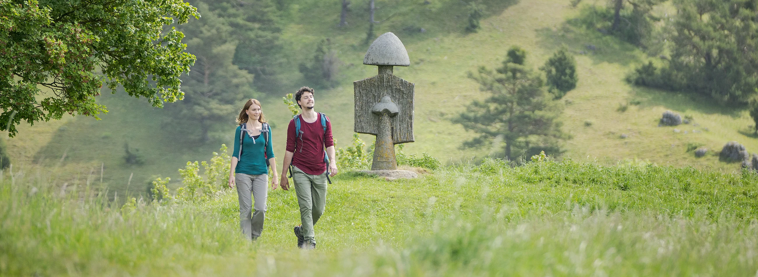 Auf der Römerbrücke sitzen zwei Wanderer Rücken an Rücken auf dem Steingeländer der Brücke. Eingerahmt von Bäumen und unter ihnen die Altmühl.Zwei Personen mit Rucksäcken stehen auf einer Wiese mit verstreuten großen Steinfiguren unter bewölktem Himmel.Panoramablick auf eine Burg auf einem bewaldeten Hügel mit Stadt und Fluss im Hintergrund bei Tageslicht