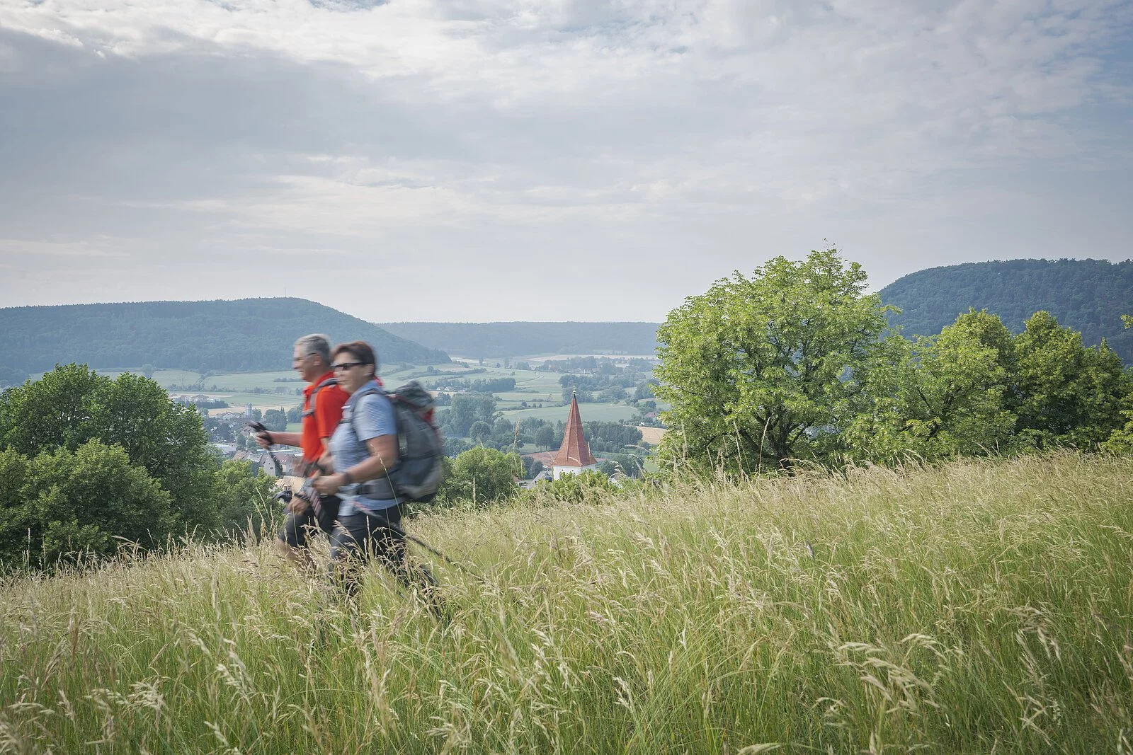 Der Weg führt jedoch der Beschilderung folgend nach rechts noch wenige Höhenmeter quer zum Hang zu einer großen Linde mit Ruhebank oberhalb der Martinskirche, von wo wir eine wunderbaren Blick auf Greding haben. Über den neu angelegten Kreuzweg steigen wir in wenigen Minuten zum Ausgangspunkt ab.