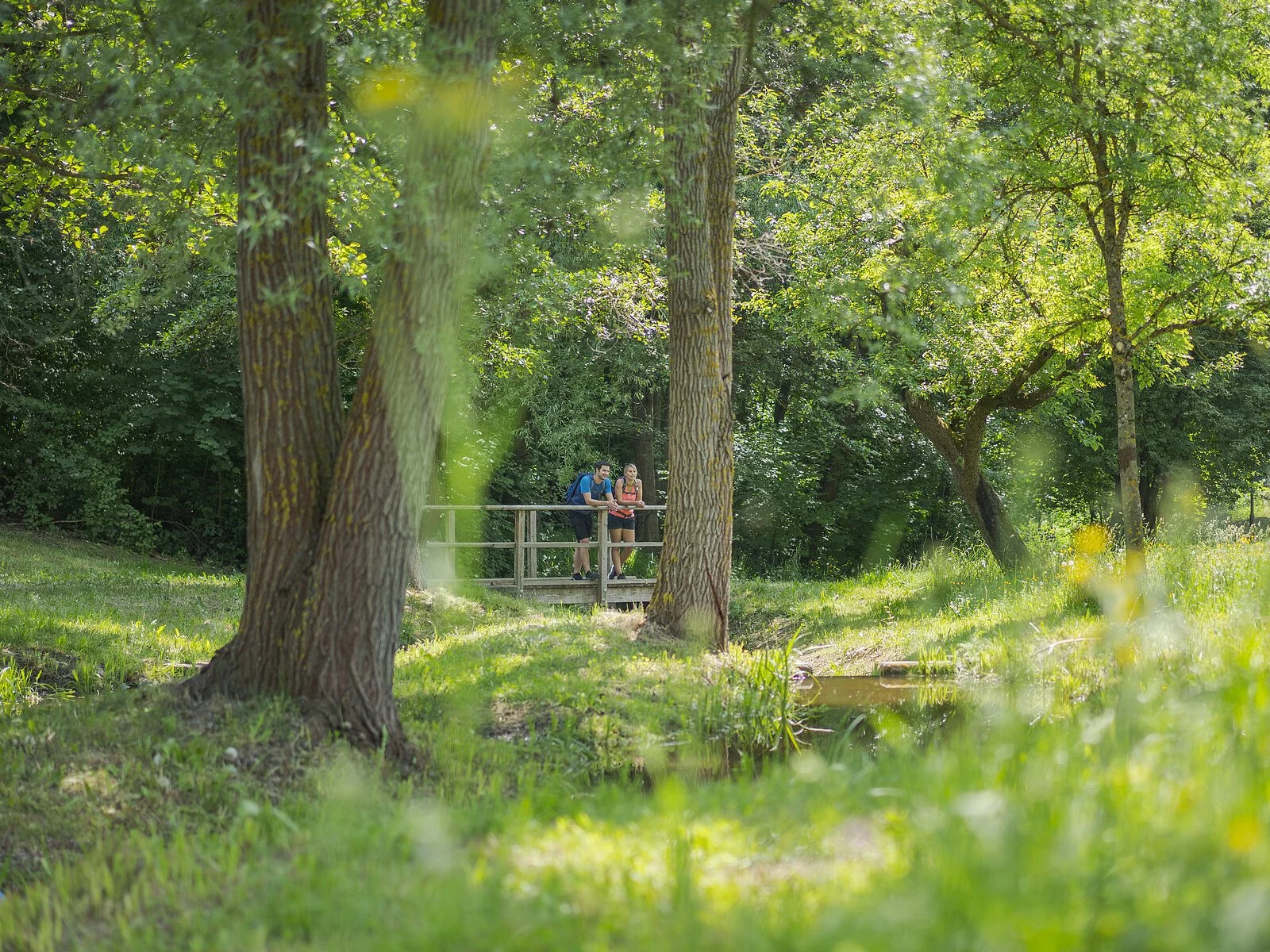 Ein paar Meter weiter schlängelt sich der Weg einen Hügel hinauf. Schritt für Schritt erklimmst du den kleinen Berg und lässt den Alltagslärm hinter dir. Oben angekommen eröffnet sich vor dir die weite Jurahochfläche und dein Blick schweift über grüne Hopfenfelder. Du kannst die Ruhe förmlich spüren und die Natur nimmt dich gefangen. Das Leben wirkt so leicht und unkompliziert. Der Weg führt dich weiter in den kühlen und schattigen Wald bevor sich das plätschernde Kaisinger Tal vor dir auftut.