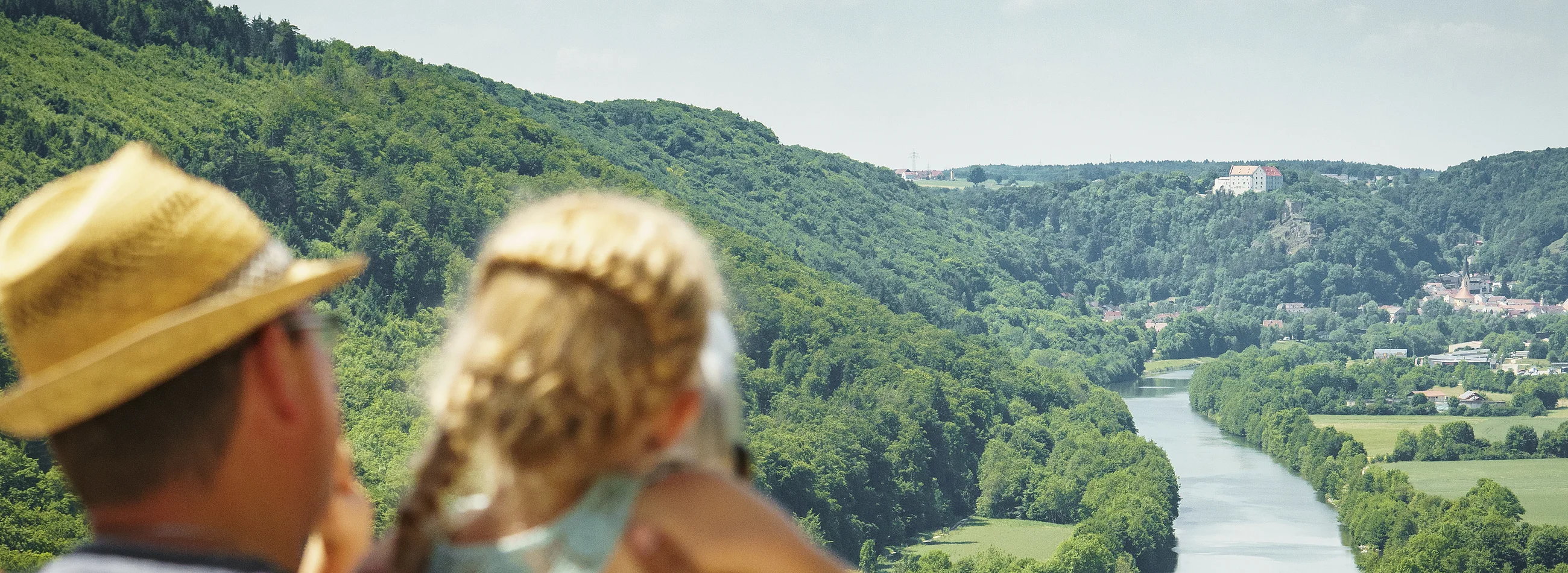 Der Rückweg führt Sie zunächst bergab. Bei einem Wasserhäuschen zweigt die Route dann rechts in den schattenspendenden Buchenwald ein und verläuft auf einem Höhenweg hoch über dem Tal entlang, bis Sie im Riedenburger Ortsteil Prunn ankommen. Hier folgen Sie der Bergstraße hinab und biegen rechts in den Scheibelweg ein, der am Ende in einen Pfad übergeht, der oberhalb der Felder und Wiesen Richtung Riedenburg führt. Kurz vor der Kapelle in Emmerthal biegt der Weg nach rechts ab. Gleich danach halten Sie sich links und wandern auf einem Wiesenweg links den Hang hinauf. Über Holzstufen geht es für Sie wieder bergauf und wandern einige Zeit am Waldrand entlang und können herrliche Blicke auf Riedenburg mit Schloss Rosenburg und seinen Burgruinen Tachenstein und Rabenstein genießen.
